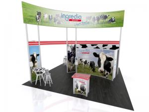 When it comes to island exhibits, sometimes a simple approach is better. The VK-5131 has a large 23 ft. long x 16 ft. high curved two-sided curved header for maximum visibility. The island design includes two modified MOD-1552 reception counters and MOD-1432 Bistro Charging Tables with Branding. In addition, there's a oversized closet with a full-size door for storage. All that would make for a pretty impressive island exhibit, except you need a place to sit down with your clients to negotiate that whopper multi-million dollar order.