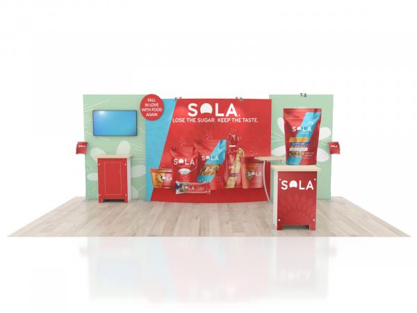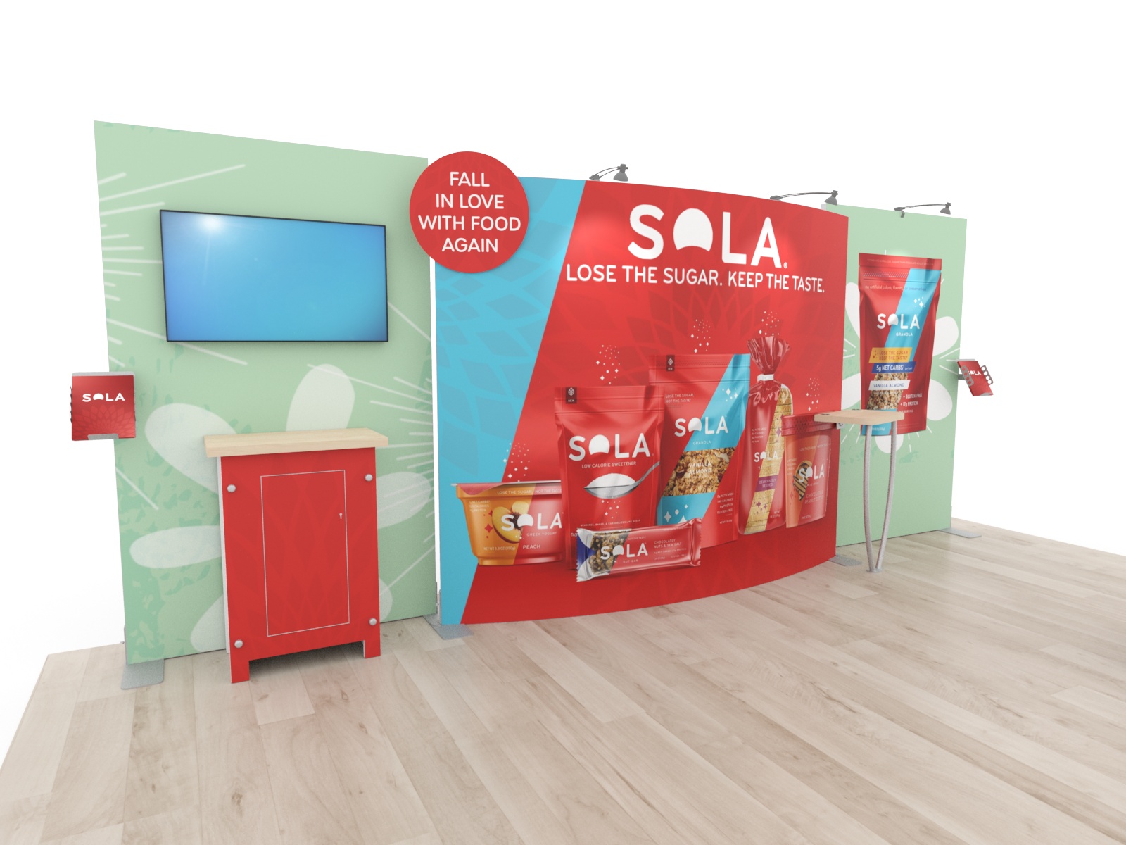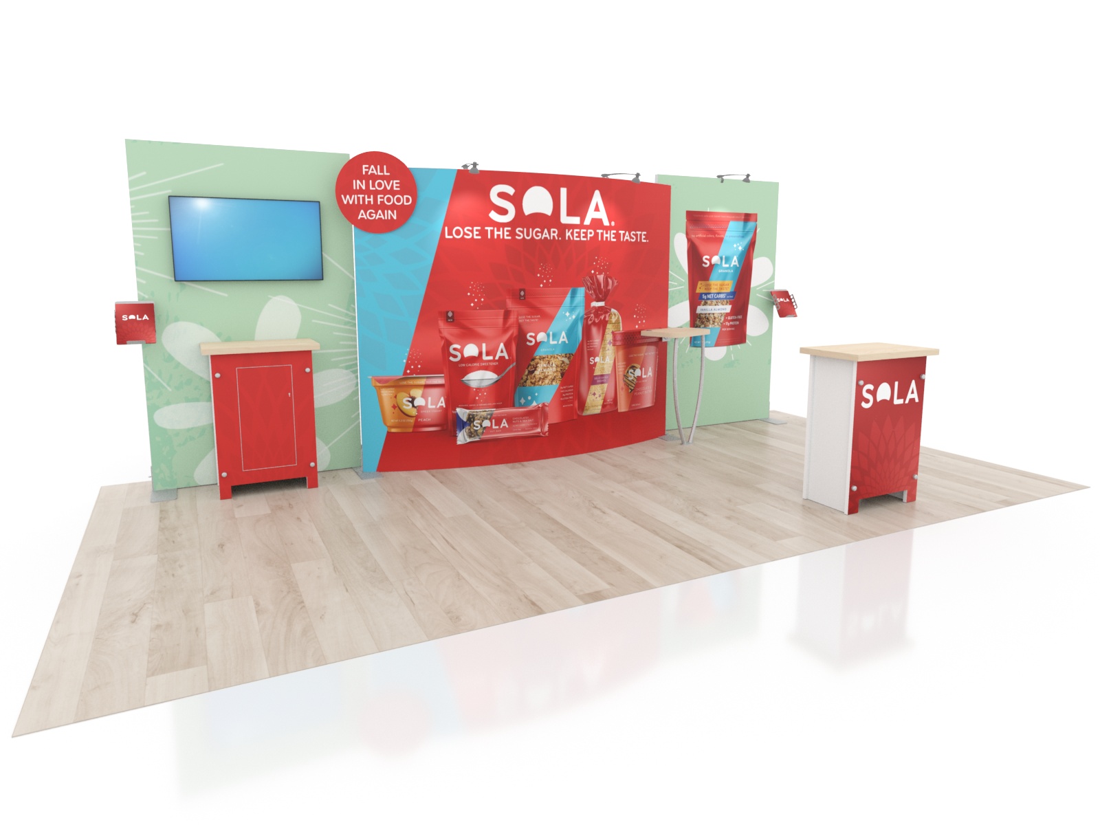 Graphics: Primarily one large tension fabric graphic @ 7.5 ft x 6.75 ft with a smaller tension fabric graphic and/or direct print graphics. Velcro tension fabric connections.