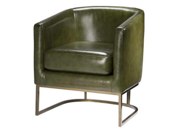 Introduce a touch of vintage elegance to your event with this barrel-style accent chair, a distinctive piece that is sure to draw attention. The chair features a curved back upholstered in a rich, moss green leather that perfectly complements its bronze-toned metal frame. Whether used as a stand-alone statement piece or as part of a seating ensemble, this chair's unique style and comfortable design make it an excellent addition to any event setting. Dims: 26"L 25"D 30"H