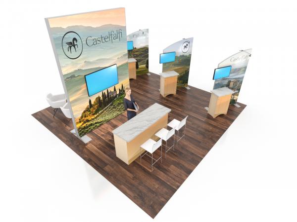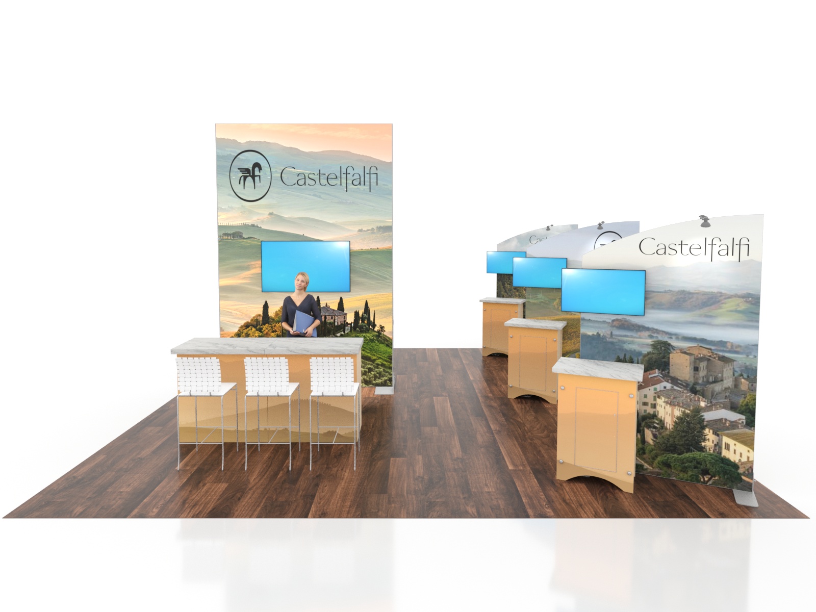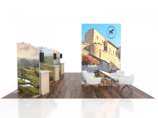 The designs include two seating areas: a bar with locking storage and casual seating with rental furniture. For more visibility, add a hanging sign to ensure your brand is conspicuous throughout the show hall.