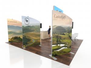 Island exhibits don’t have to cost six figures. Many are less than half that price. The VK-5210/5211 island series are attractive, multi-functional exhibits with large backlit and non-backlit fabric graphics. The design features double-sided workstations with monitor mounts and locking counters. There’s even a stunning 12 ft. H double-sided lightbox.