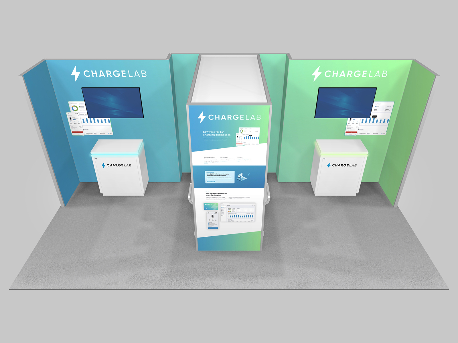 Choosing the right design depends on your goals. The RE-2161 includes (2) closets with locking storage. The RE-2160 has (3) monitor mounts for demos or sales presentations. And the RE-2159 has both a large closet and reception counter. All three an attractive arch canopy with graphics and a semi-private waterfall counter. Assembly is fast with the Gravitee Modular panels and SuperNova lightboxes (no tools) and the counter are either fully or mostly pre-assembled for easier setup.