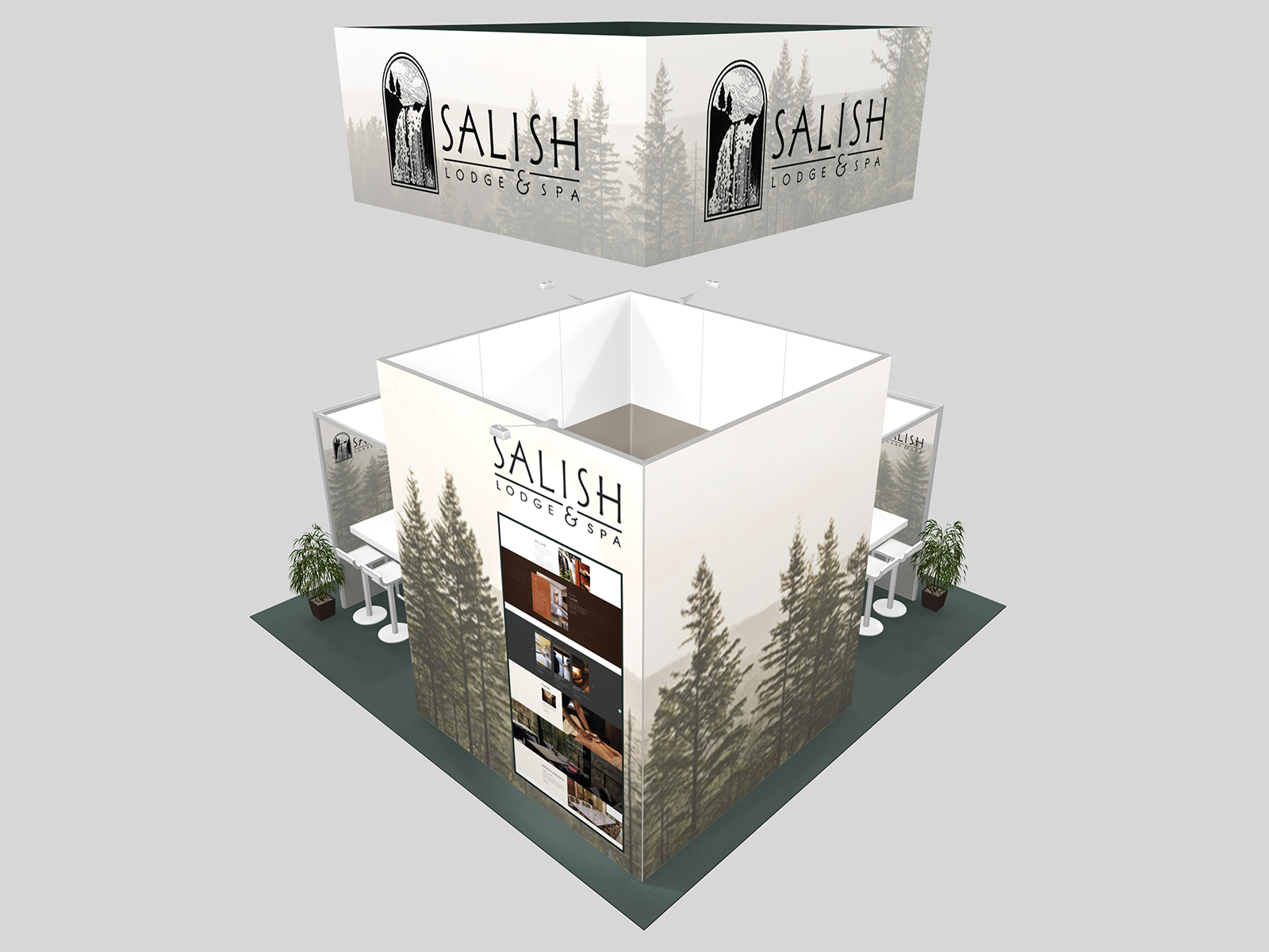 Canopies are cooler than ever before! More and more trade show island designs are incorporating canopies to add depth and dimensionality. The RE-9211, 9212, and 9214 series shows how canopies can stretch the booth space while also creating semi-private meeting areas for demos and meetings.