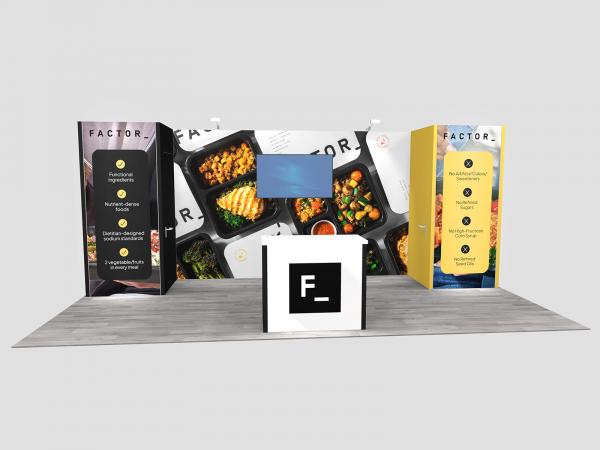 Quite often, a few custom elements added to the design can give the entire design a custom look even if it’s as simple as some colorful laminated workstations, shelves, or a reception counter. Custom laminated soffits and backlighting are also nice touches that are inexpensive and well worth the investment. As a bonus, if you re-rent the same exhibit, your second rental will most likely be less expensive, since your first rental covered the cost of those custom components.