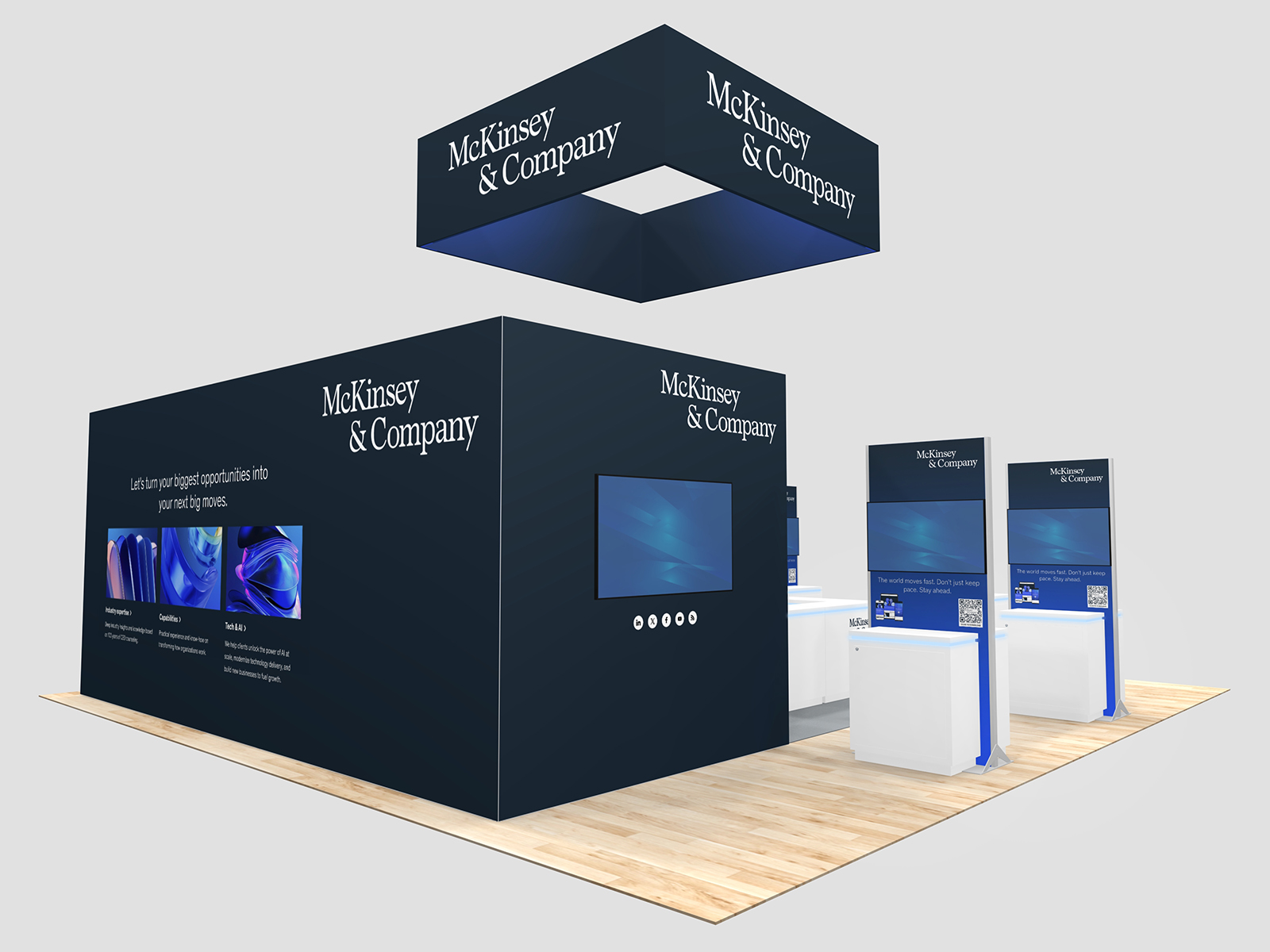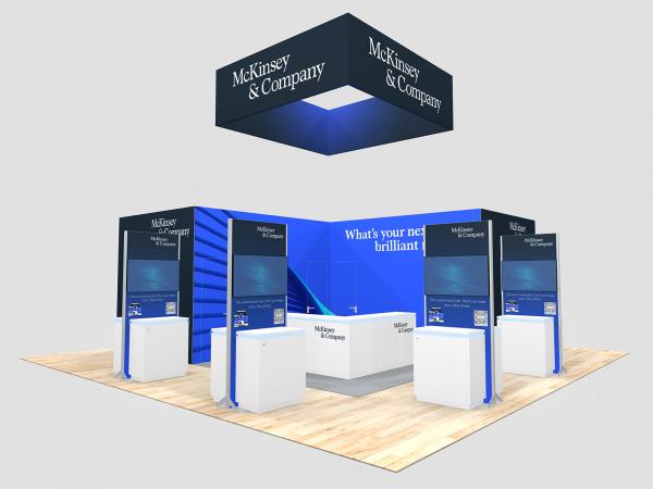 All those exterior walls are ideal for large format graphics. The branding and messaging potential is impressive, and the hanging sign serves as the perfect visual beacon to attract trade show attendees from the farthest corners of the floor. Best of all, the modular walls assemble without tools, and the counters are fully assembly. For a 30 x 30 island, installation couldn't be faster, simpler, or more stress-free.
