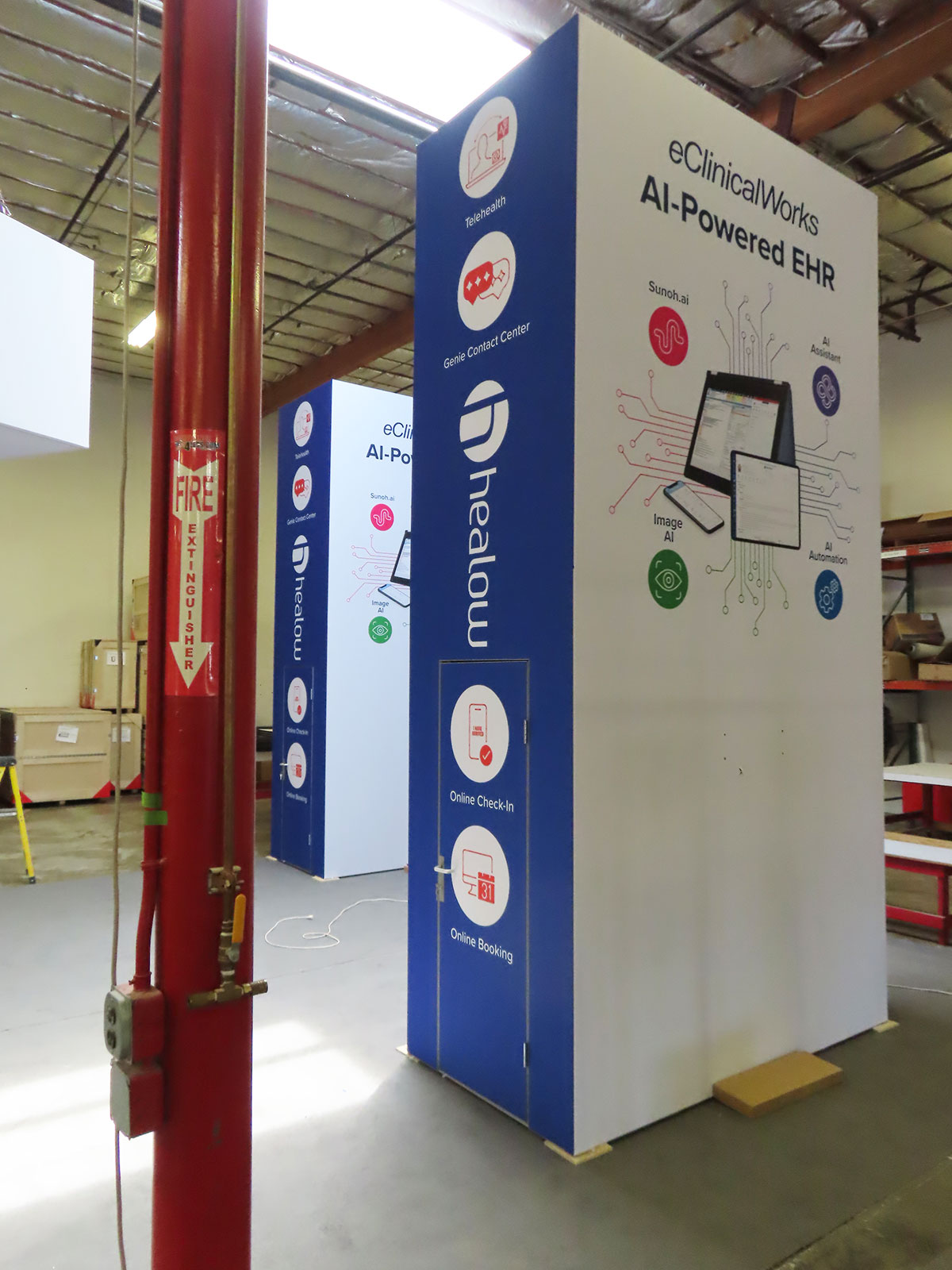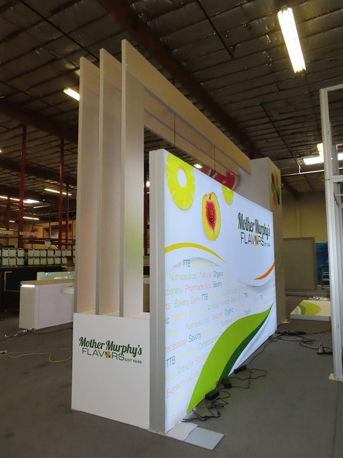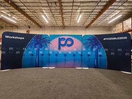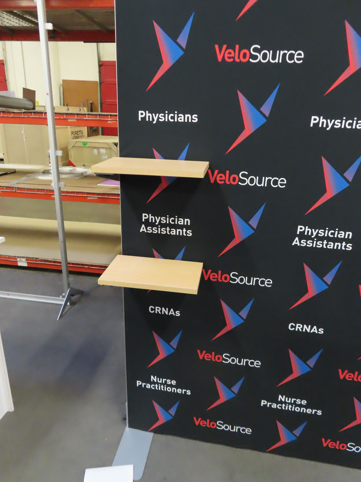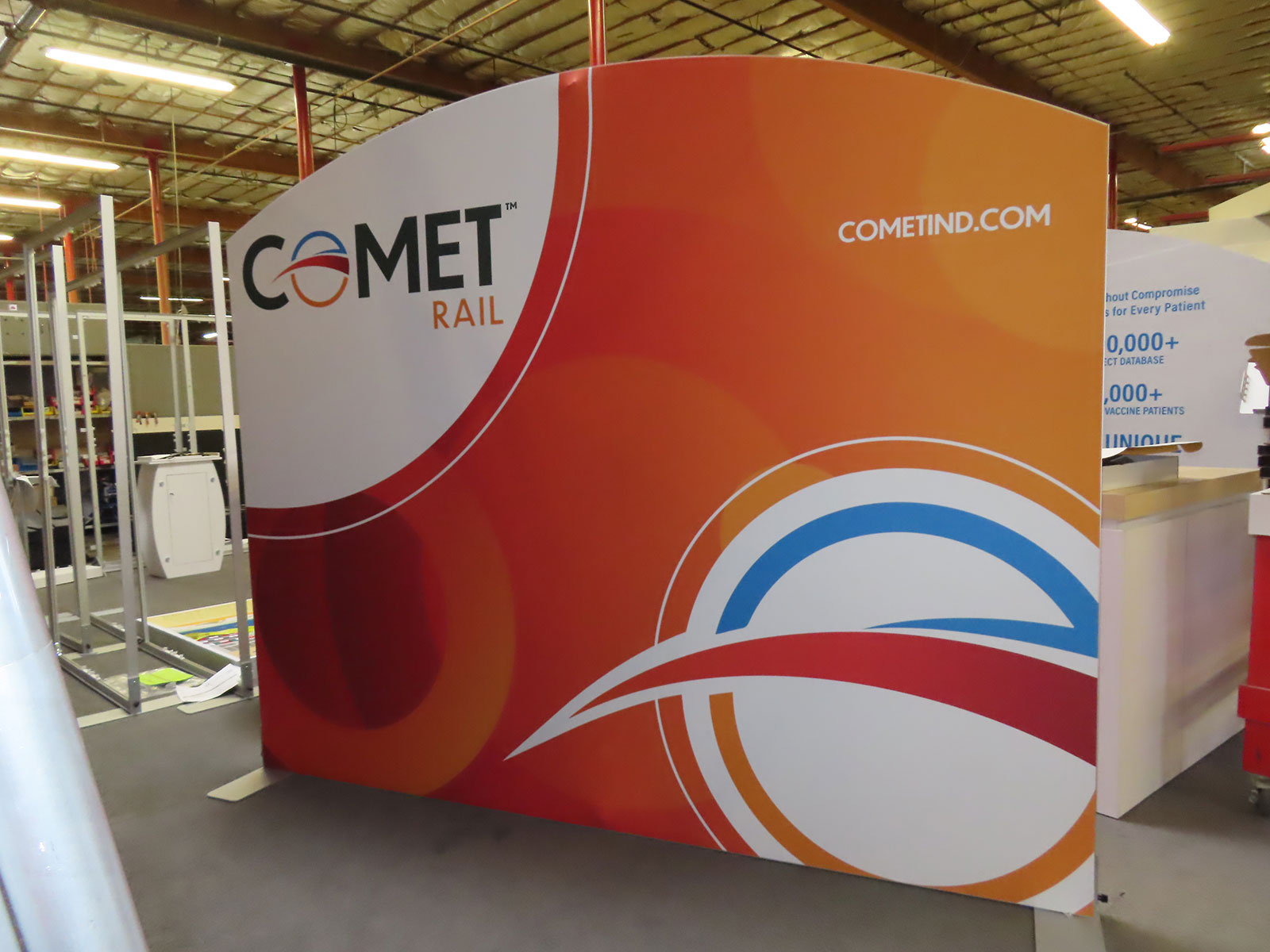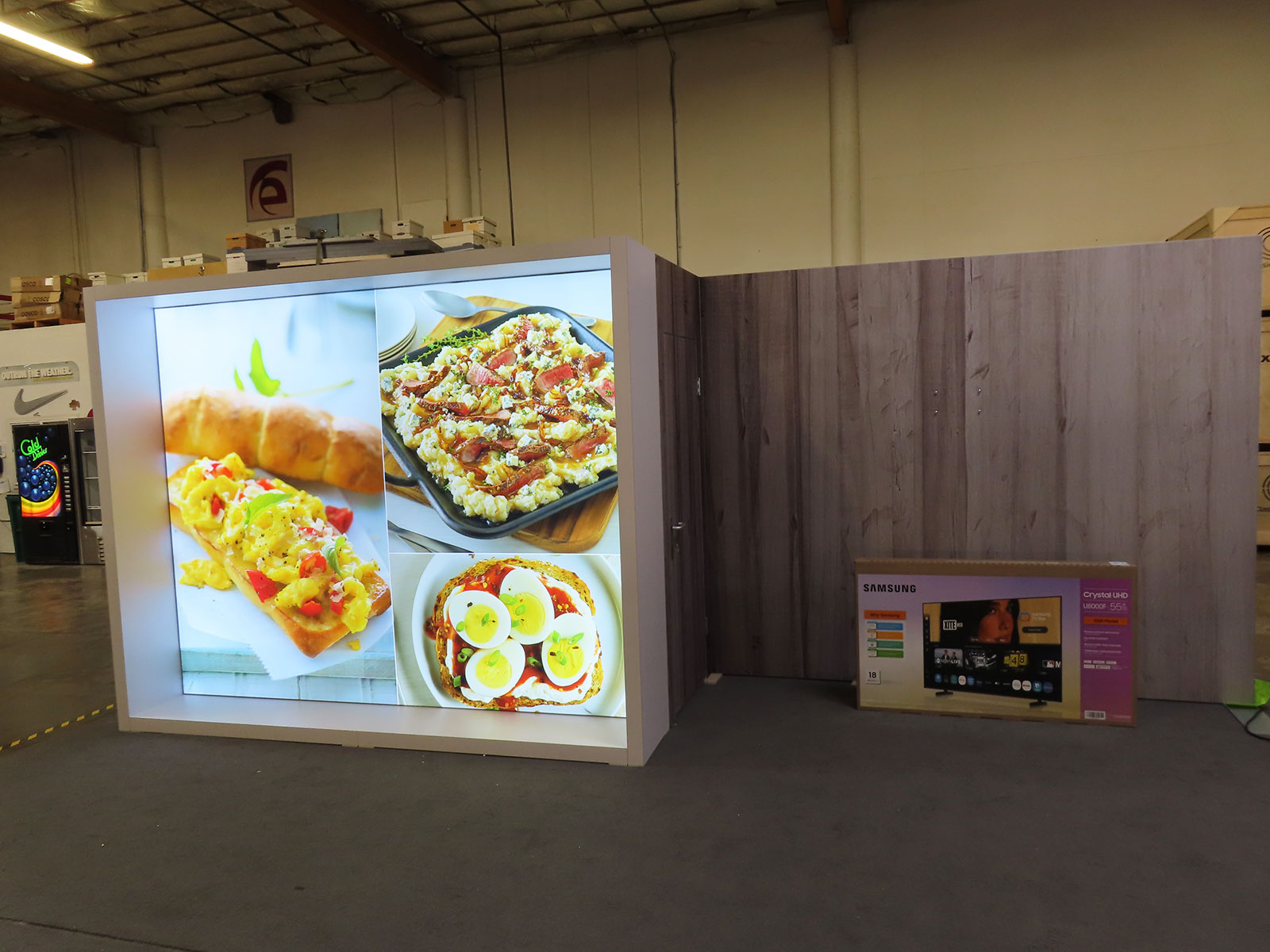 RENTAL: Modified RE-2103 Inline Design with Gravitee Panel System Backwall, Custom Hardrock Maple Laminated Soffits with Recessed Puck Lights, Extrusion Supported Laminated Shelving, Large Monitor Mount, 85" Monitor with HDMI Cable, SEG Fabric Graphics [ORD-69166]