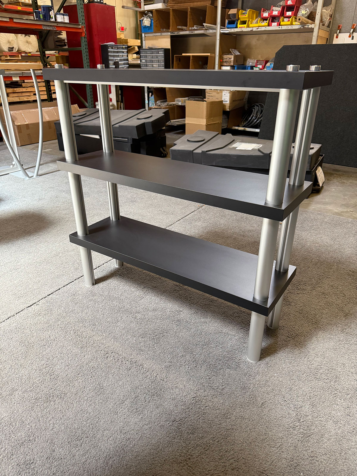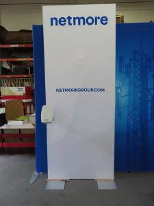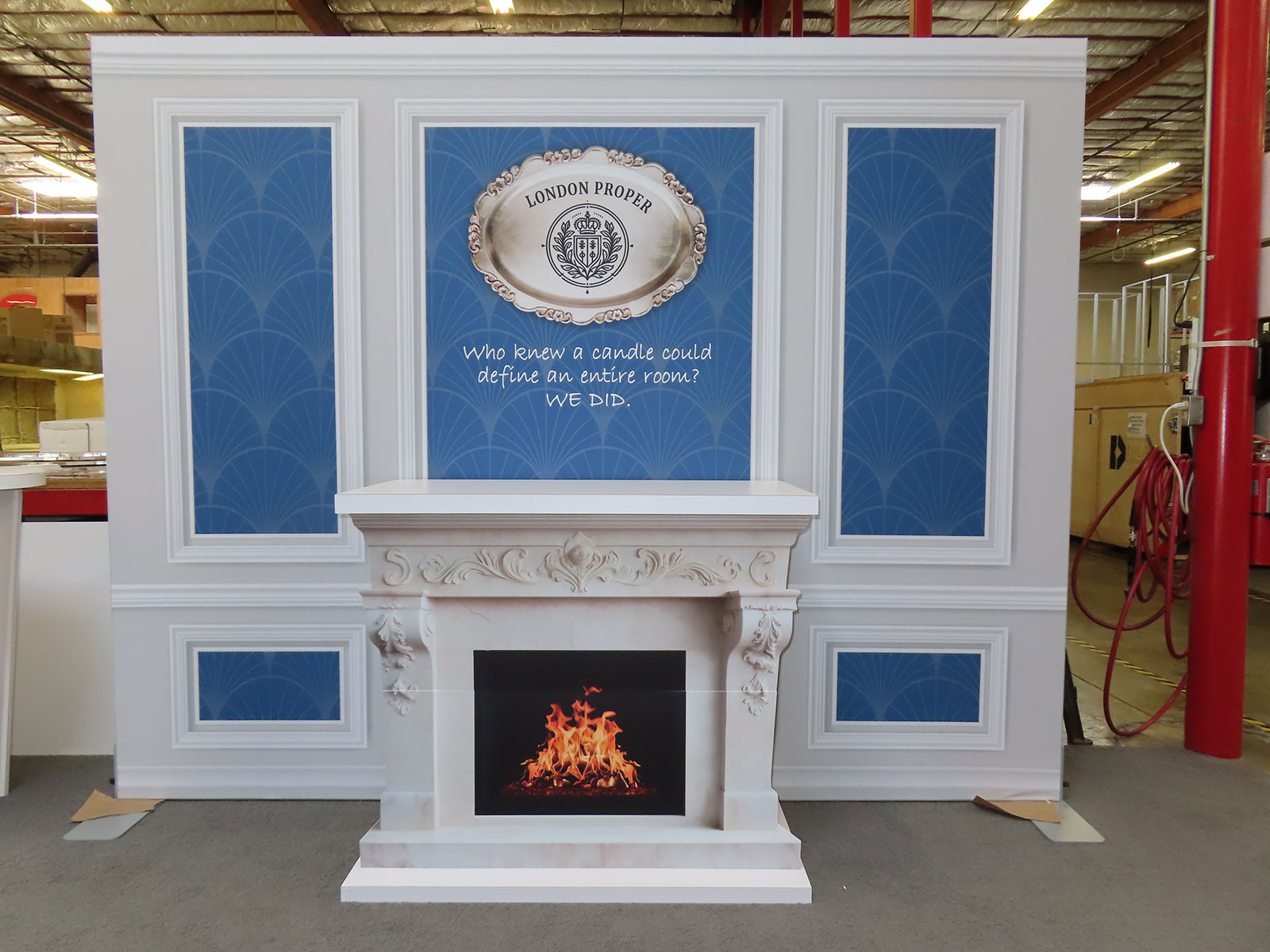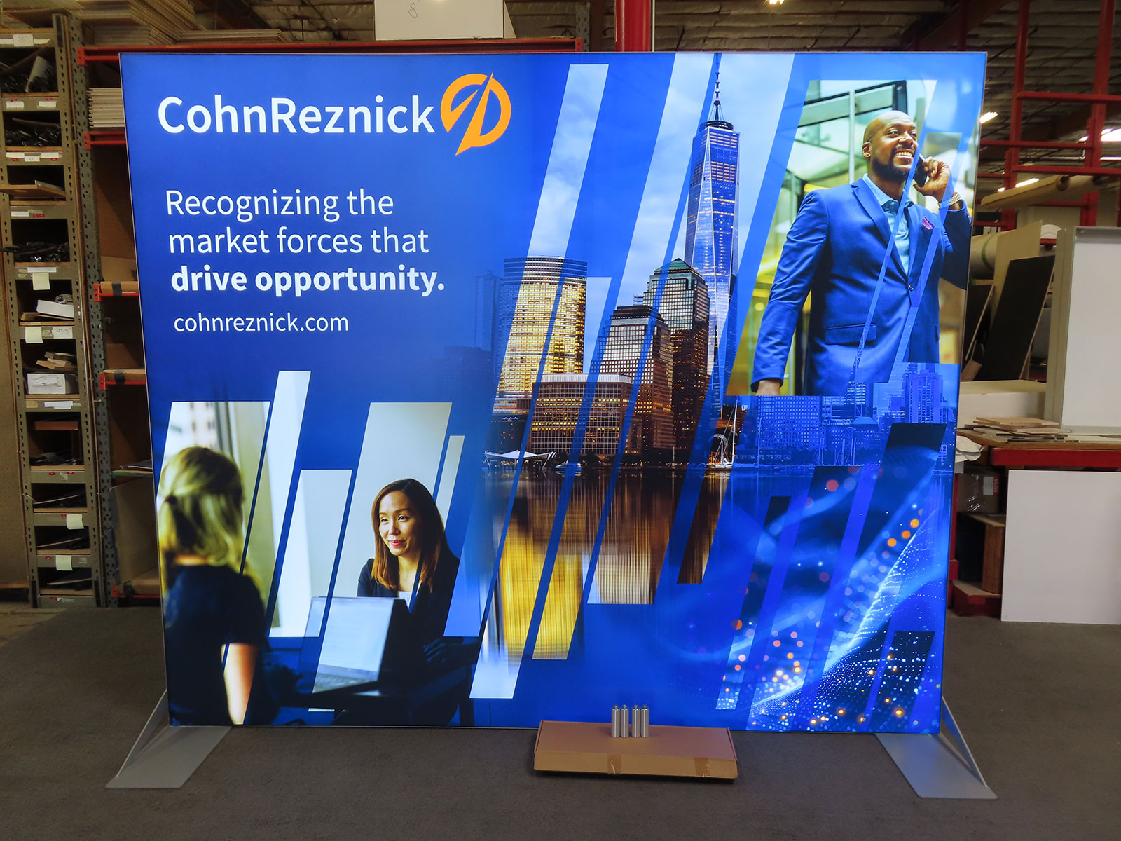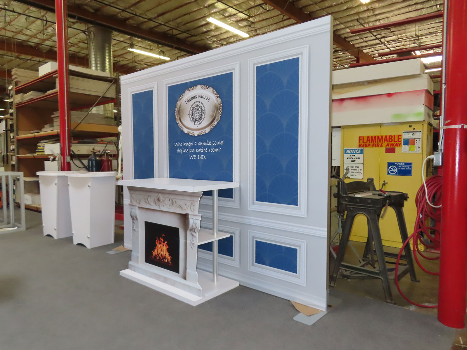 RENTAL: Modified RE-2103 Inline Design with Gravitee Panel System Backwall, Custom Hardrock Maple Laminated Soffits with Recessed Puck Lights, Extrusion Supported Laminated Shelving, Large Monitor Mount, 85" Monitor with HDMI Cable, SEG Fabric Graphics [ORD-69166]