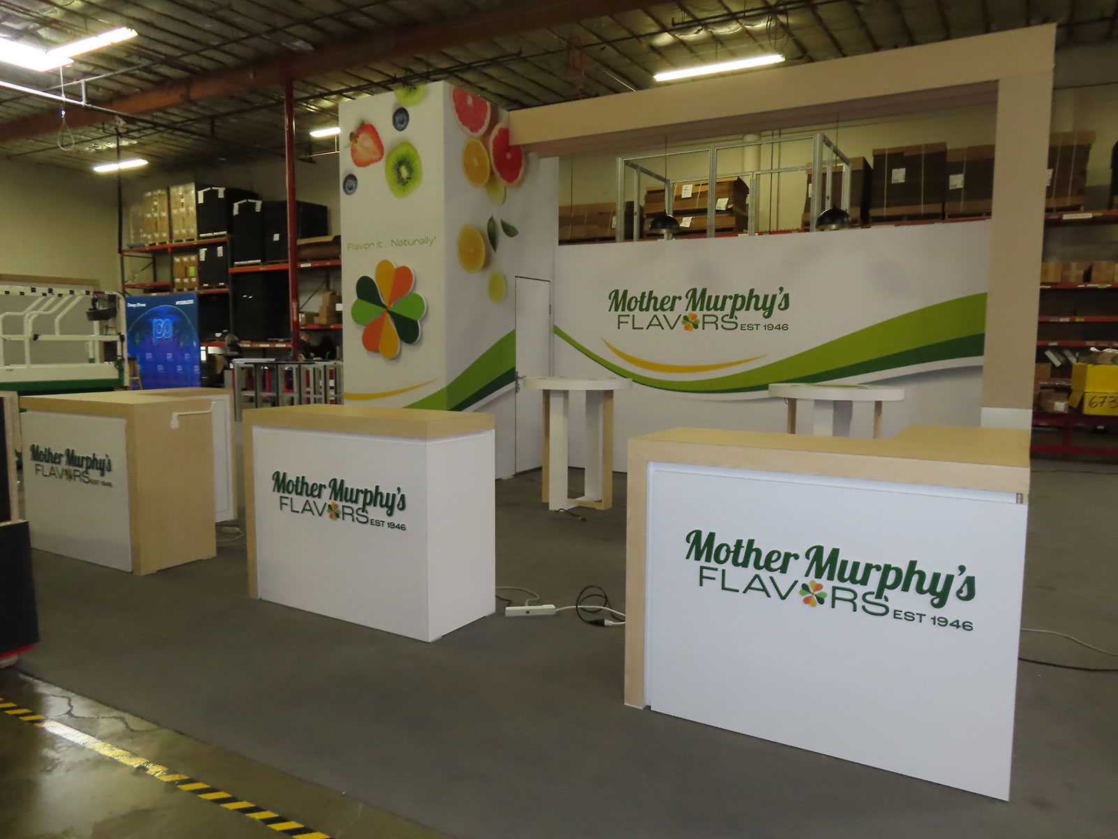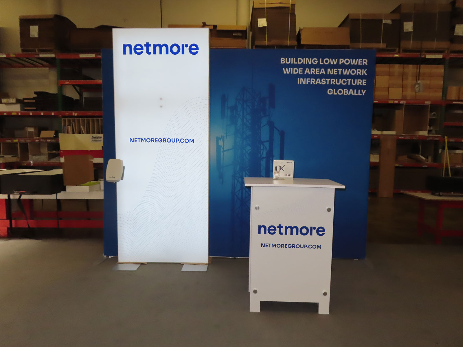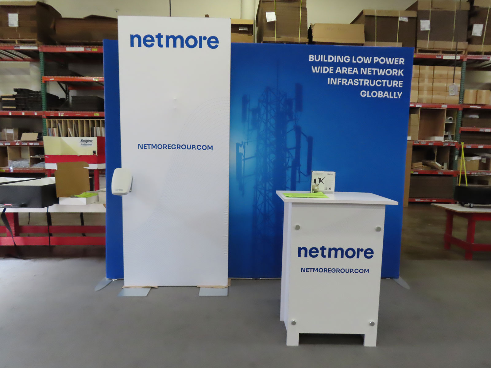 Custom Inline Exhibit with SuperNova Backlit Lightboxes, (4) Product Shelves, Storage Closet, Fabric and Direct Print Graphics, Reception Counter w/ Open Storage, and Counter w/ Locking Storage and Wireless Charging Pads [ORD-69079]
