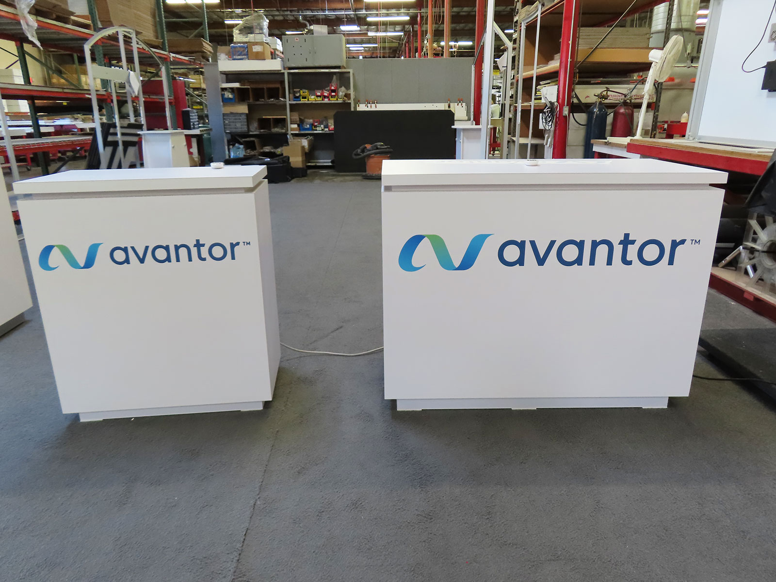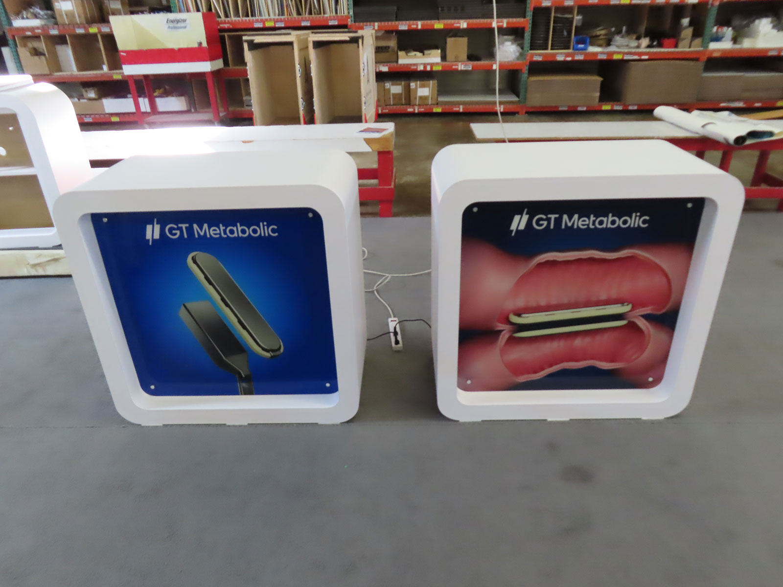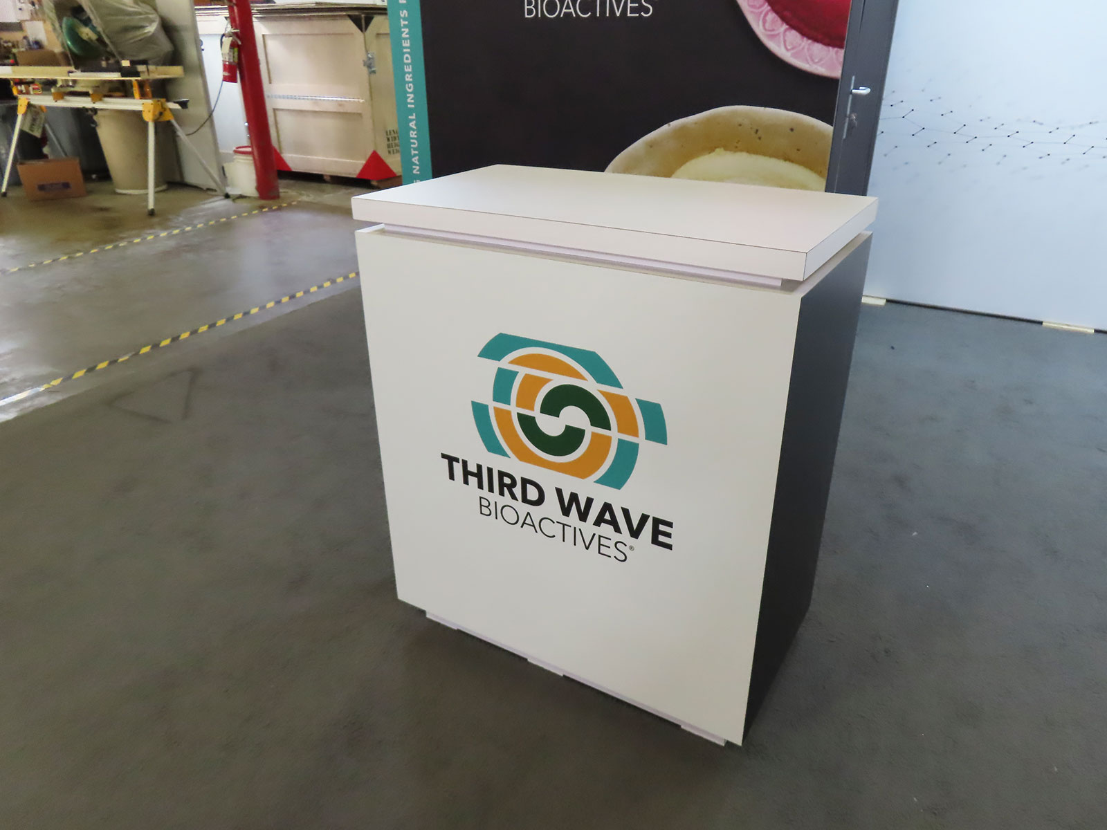 Custom Inline Exhibit with SuperNova Backlit Lightboxes, (4) Product Shelves, Storage Closet, Fabric and Direct Print Graphics, Reception Counter w/ Open Storage, and Counter w/ Locking Storage and Wireless Charging Pads [ORD-69079]