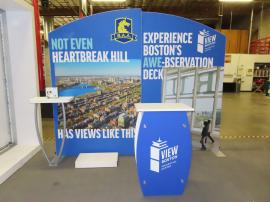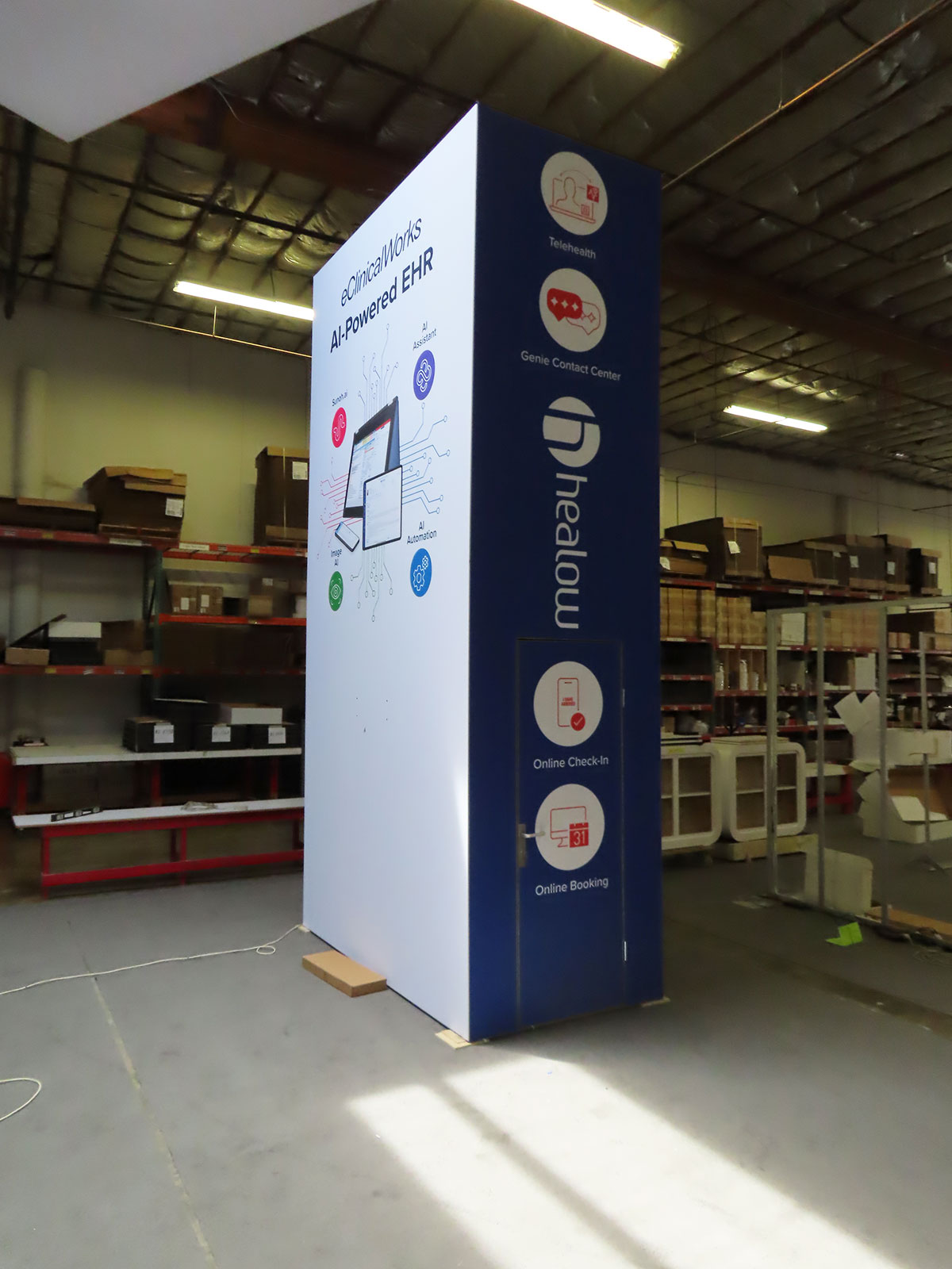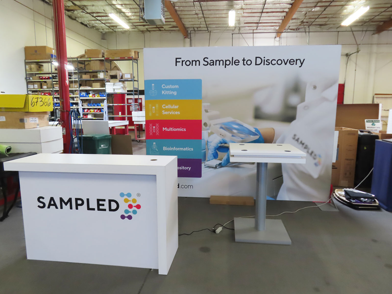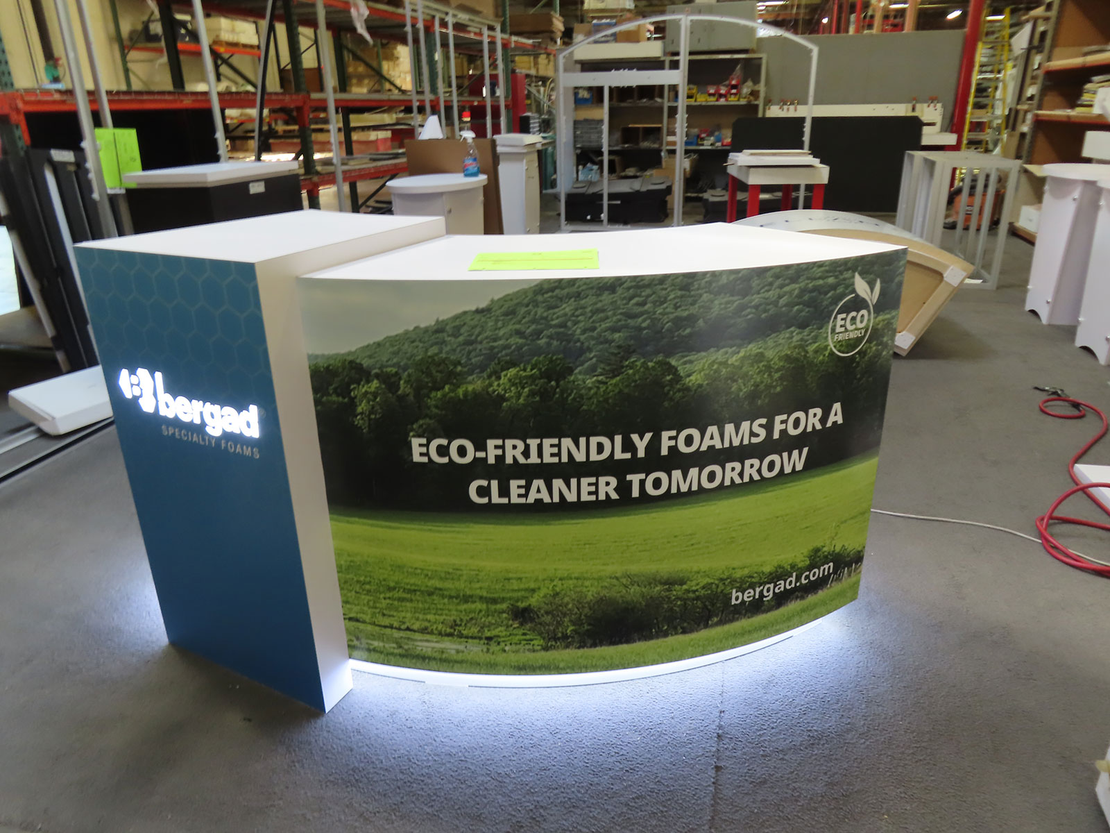 Modified ECO-2038 Sustainable Exhibit with Shelves, Locking Closet, Lightbox, SEG Fabric Graphics, Monitor Mount, and MOD-1590 Backlit Reception Counter with Locking Storage [ORD-69141]