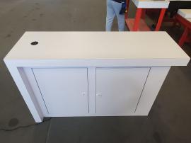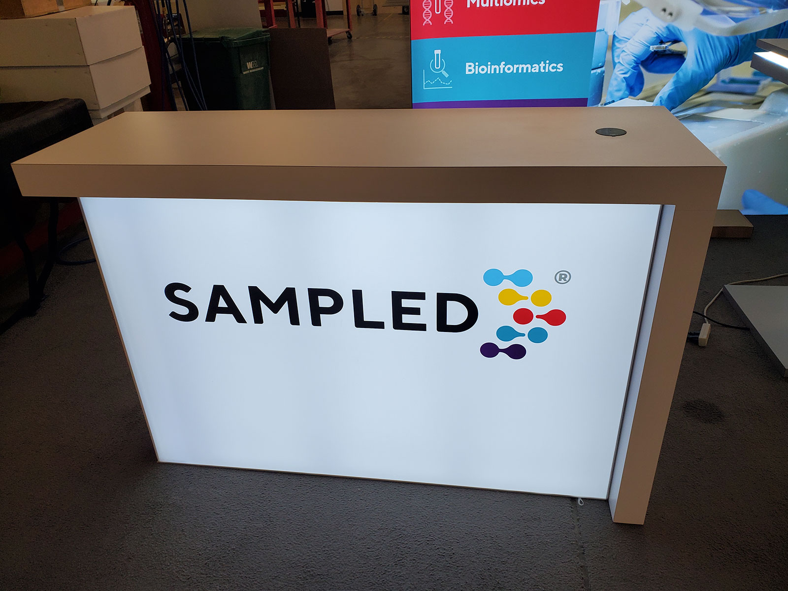 Custom Product Display Counter with Backlit Logo and LED Accent Lights, Locking Storage, and Plex Display Case Custom Product Display Counter with Backlit Logo and LED Accent Lights, Locking Storage, and Plex Display Case