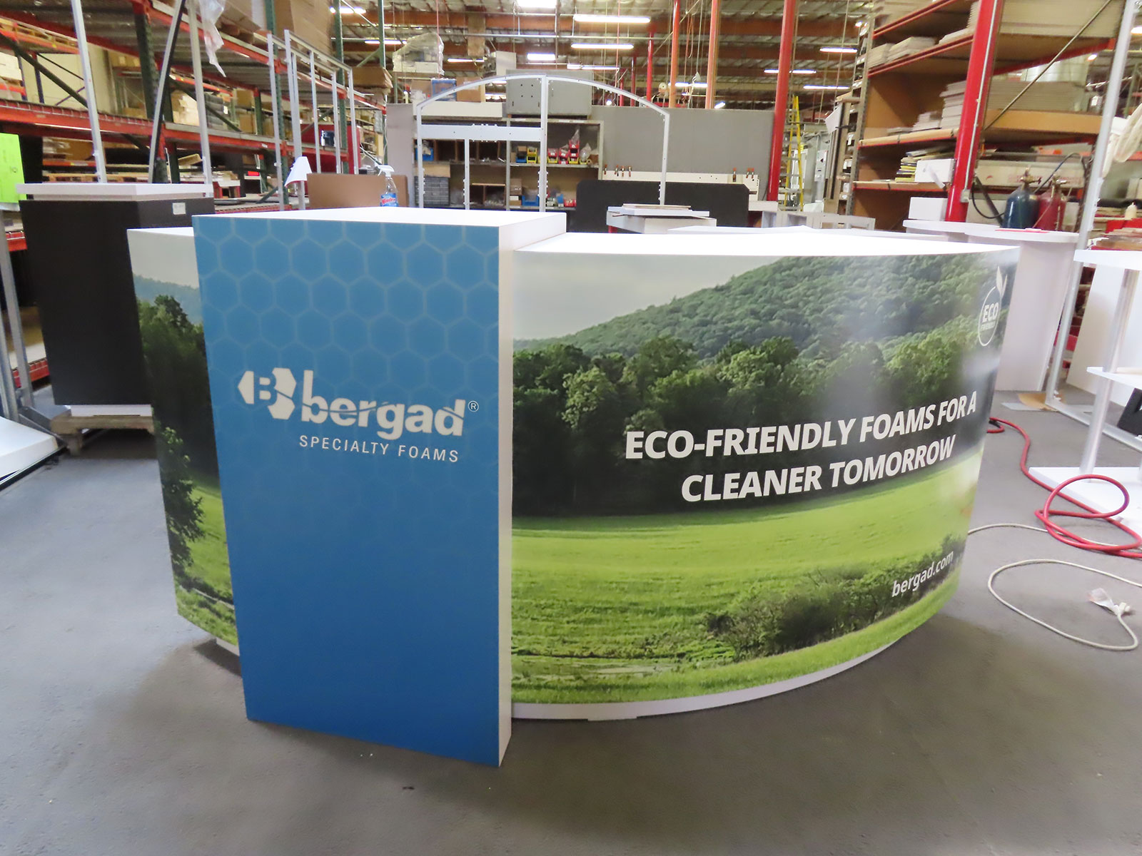 Modified ECO-2038 Sustainable Exhibit with Shelves, Locking Closet, Lightbox, SEG Fabric Graphics, Monitor Mount, and MOD-1590 Backlit Reception Counter with Locking Storage Modified ECO-2038 Sustainable Exhibit with Shelves -- View 2 Modified ECO-2038 Sustainable Exhibit with Shelves -- View 3 Modified ECO-2038 Sustainable Exhibit with Shelves -- View 4