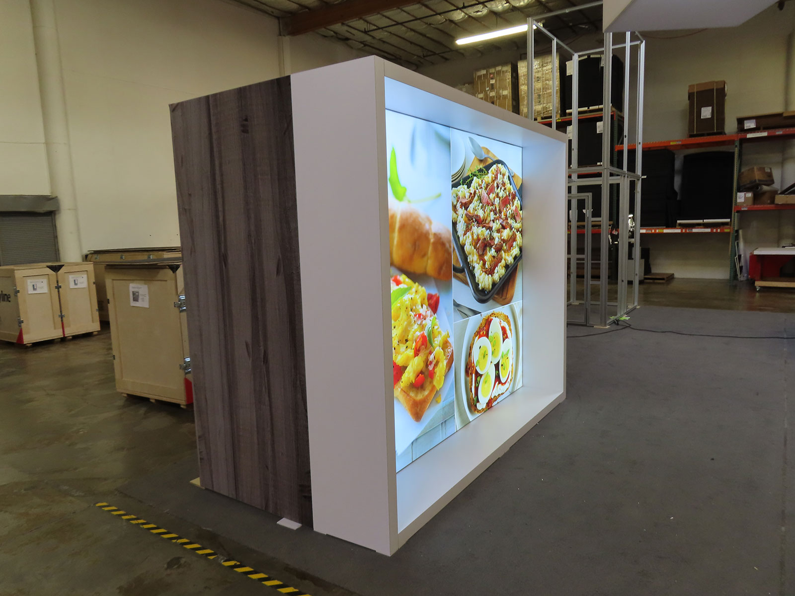 RENTAL: Modified RE-2103 Inline Design with Gravitee Panel System Backwall, Custom Hardrock Maple Laminated Soffits with Recessed Puck Lights, Extrusion Supported Laminated Shelving, Large Monitor Mount, 85" Monitor with HDMI Cable, SEG Fabric Graphics RENTAL: Modified RE-2103 Inline Design with Gravitee Panel System Backwall -- View 2 RENTAL: Modified RE-2103 Inline Design with Gravitee Panel System Backwall -- View 3 RENTAL: Modified RE-2103 Inline Design with Gravitee Panel System Backwall -- View 4