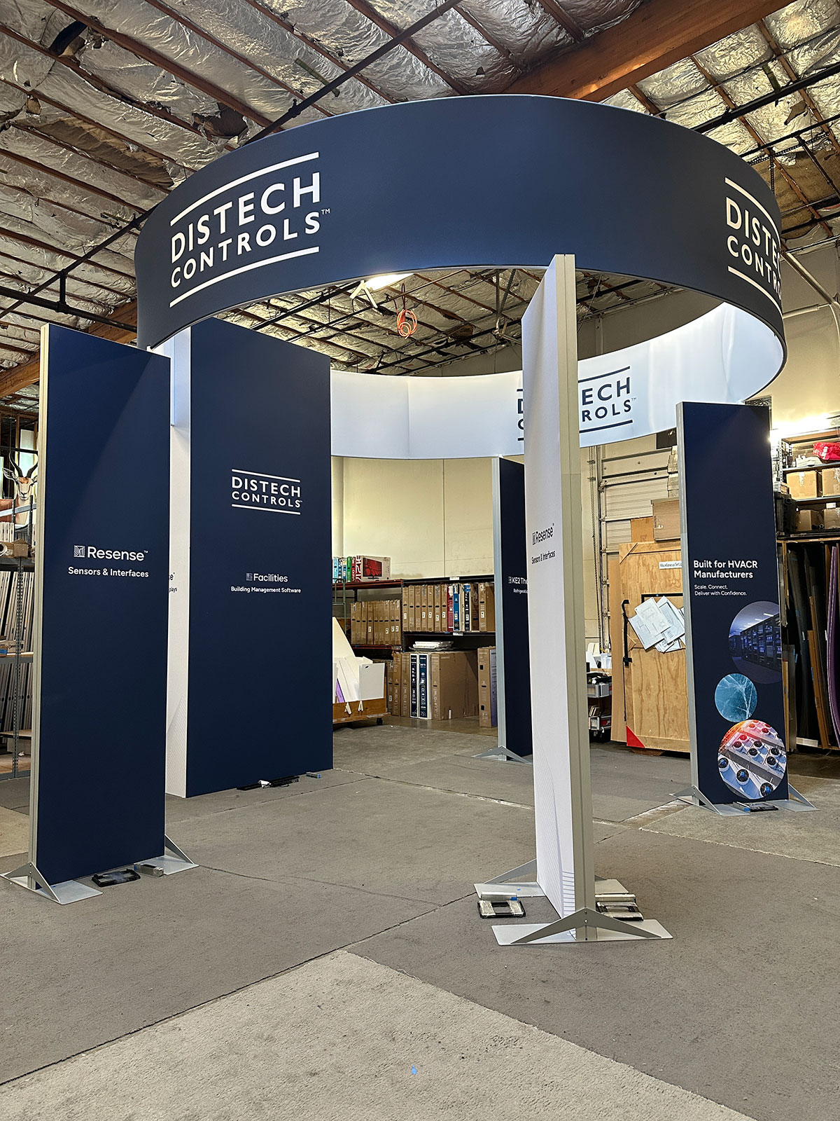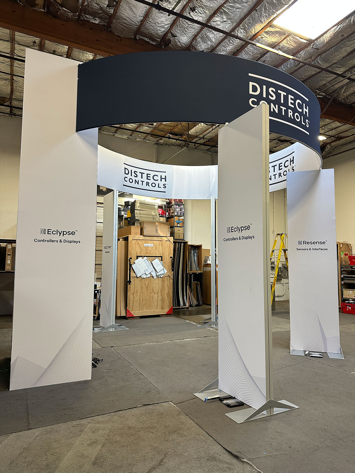 RENTAL: Modified ECO-4126 Island Design with Gravitee Storage Tower @ 72" Wide x 42" Deep x 190" High, (4) Double-Sided Kiosk Towers @ 3 ft. Wide x 12 ft. High, (2) Large Monitor Mounts, Circular Sign @ 18 ft/ Diameter x 42 in. High, SEG Fabric Graphics, and Pillowcase Fabric Graphic [ORD-69271]