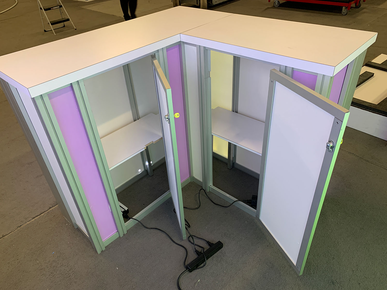 (2) Custom MOD-1596 Laminate Counters with Graphics, LED Accent Lights, and Locking Storage