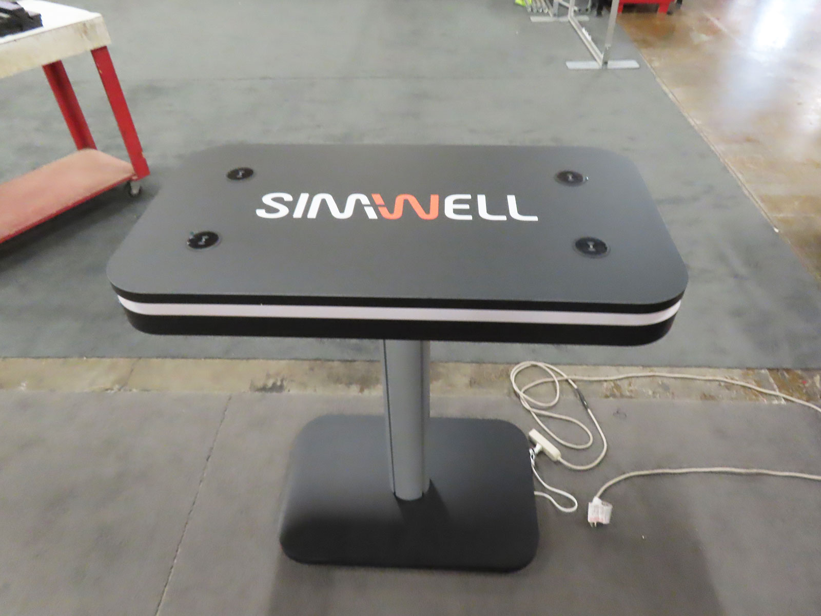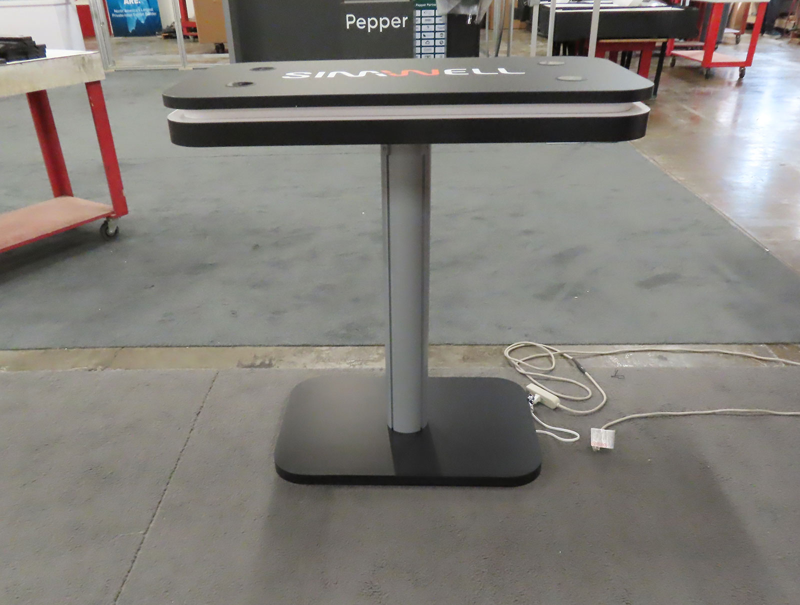 Modified SYK-2018 Symphony Portable Display with SEG Fabric Graphics, (2) Workstations with Wireless Charging, iPad Clamshells, SYM-411 Reception Counter, and Modified SYM-406 with 3D Halo Lit Logo [ORD-69321]