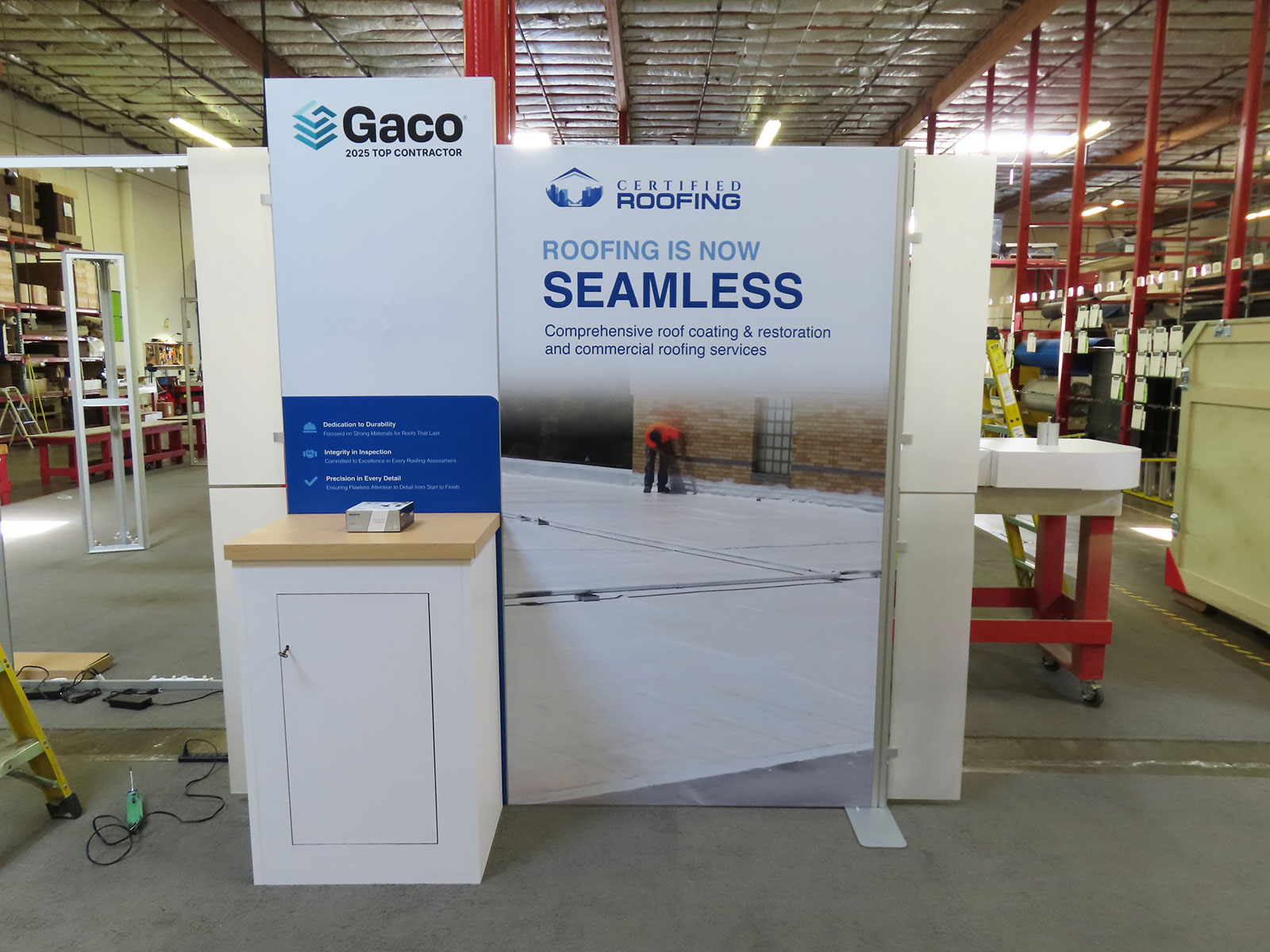 Modified ECO-2097 ecoSmart Sustainable Inline with Graphics, Storage Closet, iPad Workstation and Custom Podiums with storage [51751]