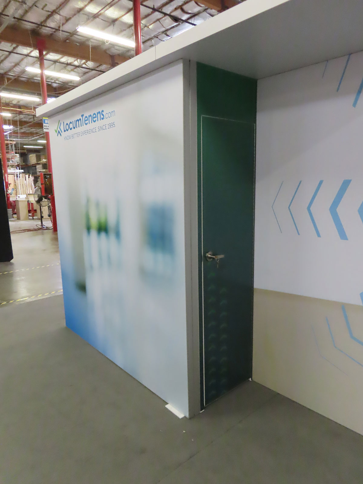 RENTAL: RE-2100 Inline Lightbox Design with Laminated Ceiling Soffits, Storage Closet with Locking Door, SEG Fabric Graphics, and Vinyl Applied Graphics