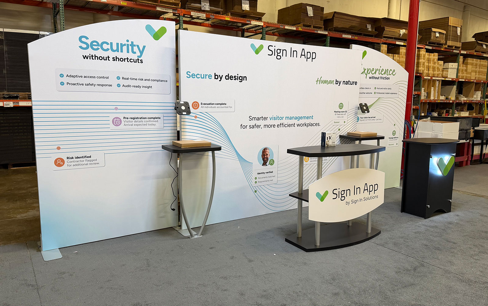 Modified SYK-2018 Symphony Portable Display with SEG Fabric Graphics, (2) Workstations with Wireless Charging, iPad Clamshells, SYM-411 Reception Counter, and Modified SYM-406 with 3D Halo Lit Logo Modified SYK-2018 Symphony Portable Display with SEG Fabric Graphics -- View 2 Modified SYK-2018 Symphony Portable Display with SEG Fabric Graphics -- View 3