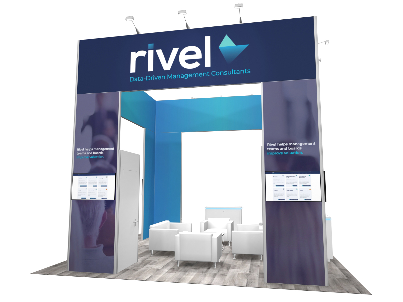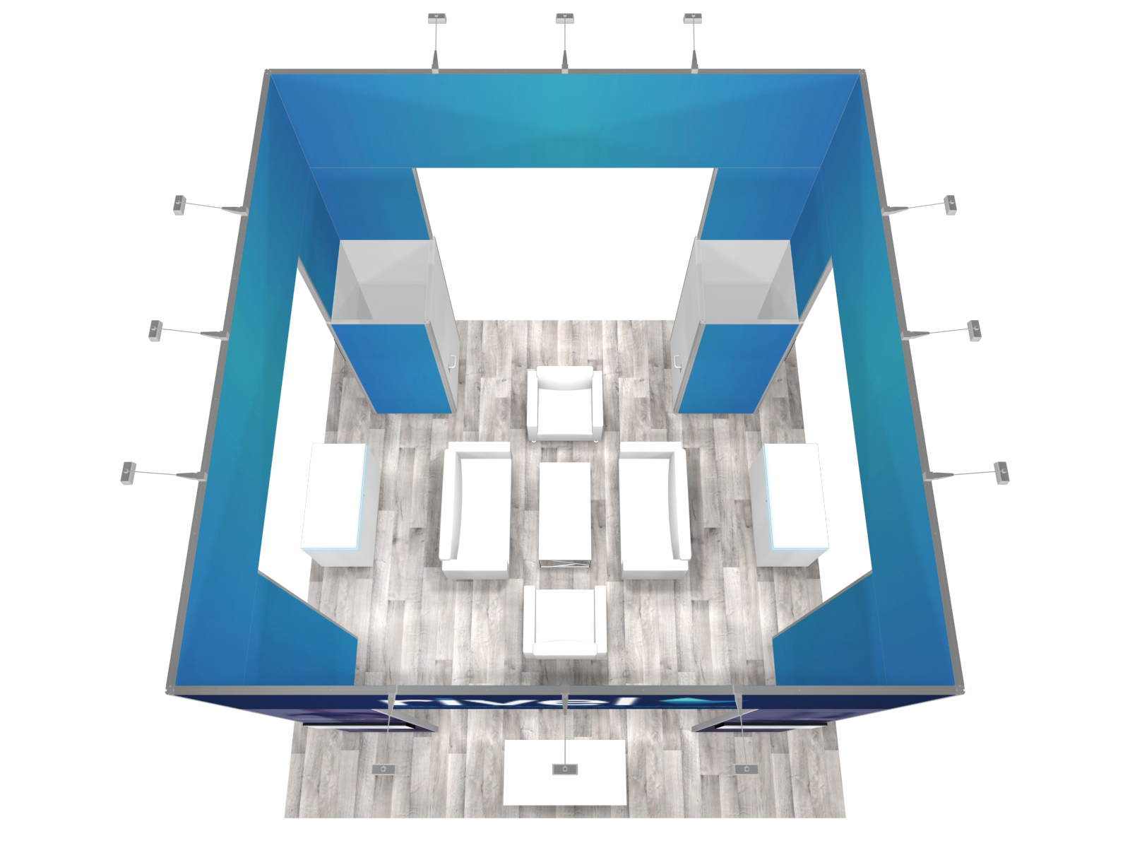 The Rental Island Exhibits go way beyond a pretty picture. We've incorporated key features such as large graphics, private and semi-private conference rooms, towers with locking storage access, and workstations and reception counters with secure storage. Not enough? Then add product shelves, large and small monitors for presentations, a variety of light fixtures, and hanging signs for high visibility from anywhere on the show floor. We also offer three contemporary double-deck configurations.