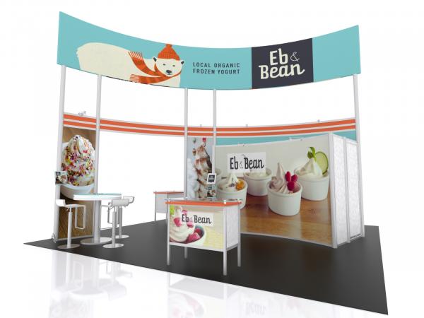 When it comes to island exhibits, sometimes a simple approach is better. The VK-5131 has a large 23 ft. long x 16 ft. high curved two-sided curved header for maximum visibility. The island design includes two modified MOD-1552 reception counters and MOD-1432 Bistro Charging Tables with Branding. In addition, there's a oversized closet with a full-size door for storage. All that would make for a pretty impressive island exhibit, except you need a place to sit down with your clients to negotiate that whopper multi-million dollar order.