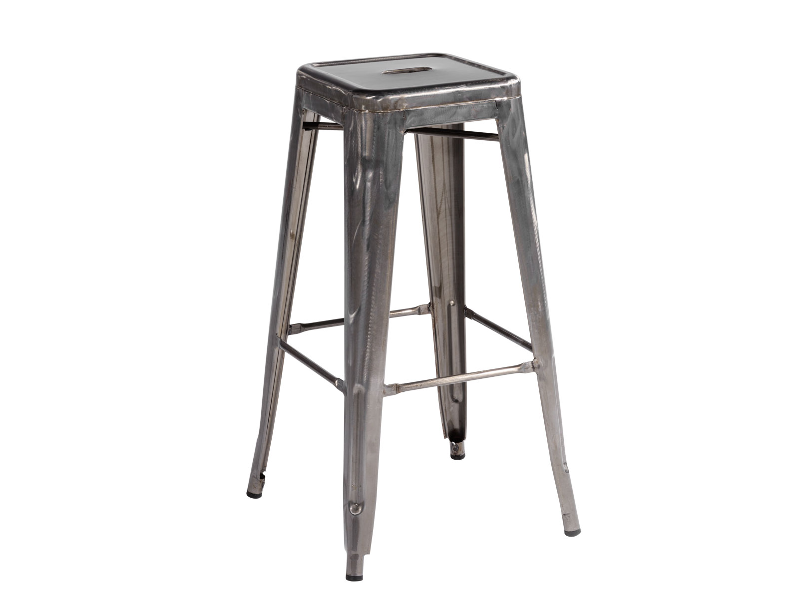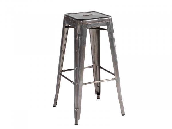 Rustique Barstool -- Trade Show Rental Mid-century French gunmetal barstool is a design classic that works in both modern and rustic designs. Length: 13, Depth: 13, Height: 30.