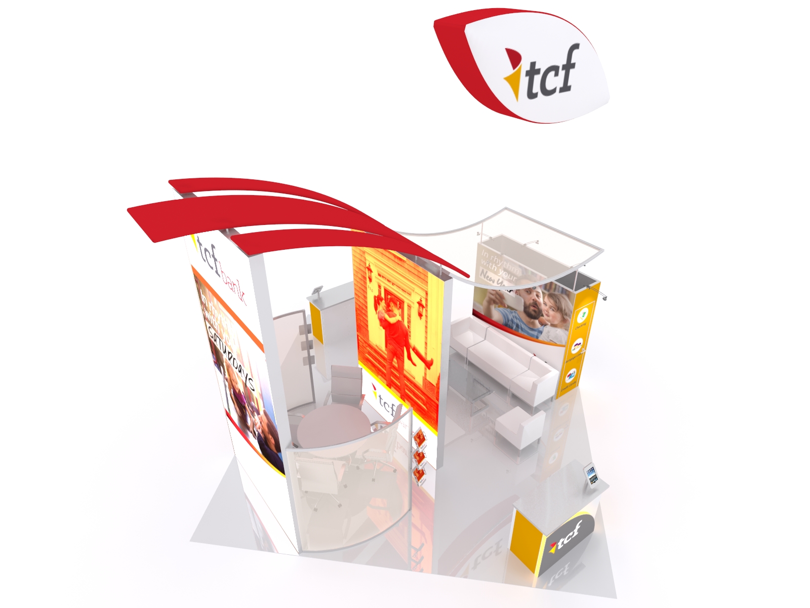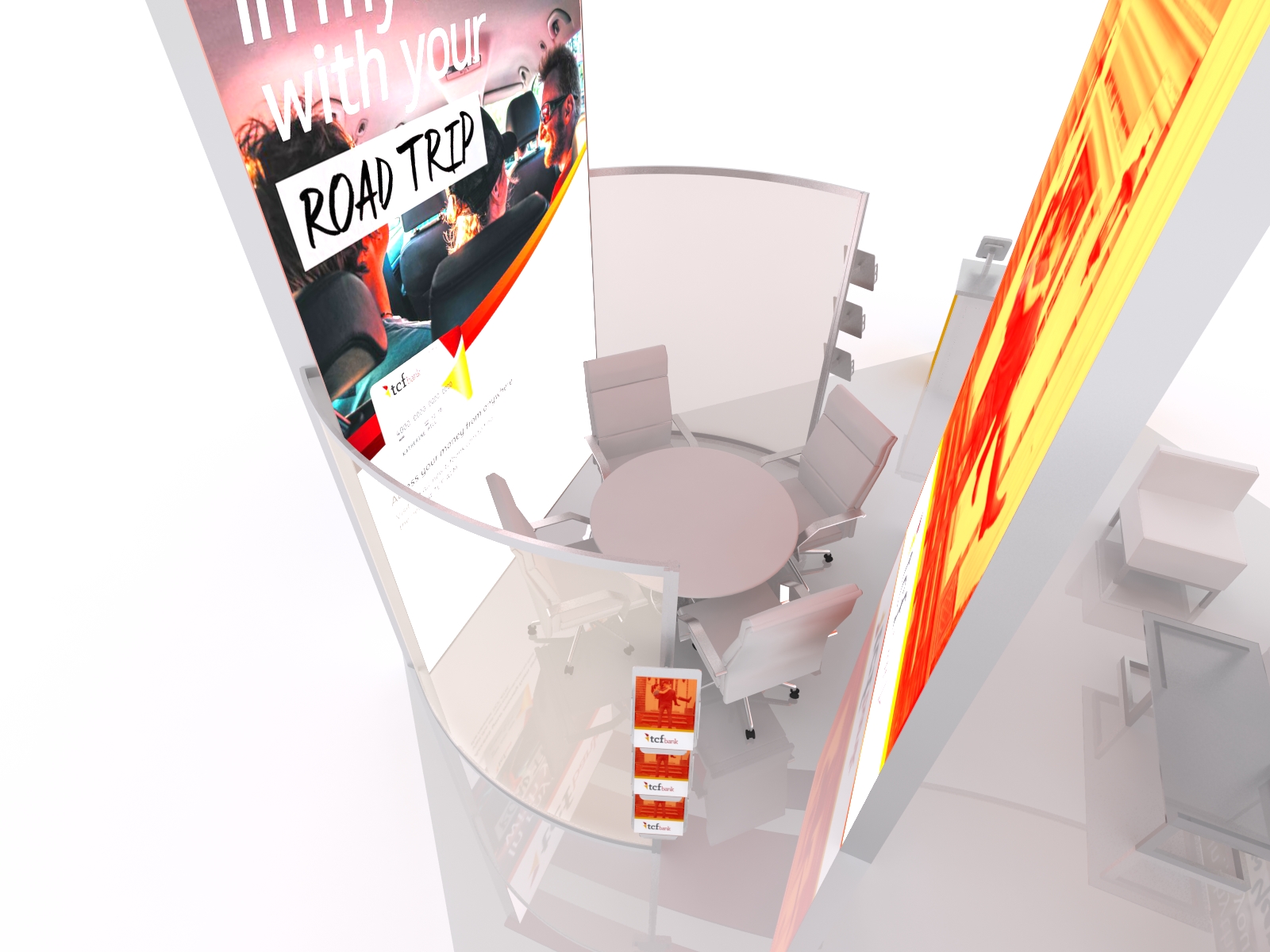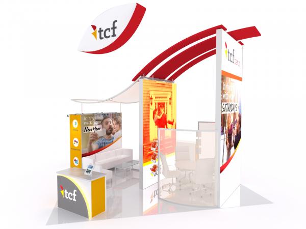 Sweeping lines, soaring heights, and bright lightboxes ensure this will be the "Belle of the Ball" at any tradeshow. The VK-5145 island has two towering double-sided lightboxes, topped with elegant curved canopies. The lightboxes frame a semi-private conference room with semi-transparent scrim fabric walls. There's also another casual lounge area along with two practical reception counters with MOD-1329 iPad Swivel Mounts. Need storage? The VK-5145 has a large full-size closet along with storage in each reception counter. The cherry on the exhibit sundae is the Aero hanging sign designed to not only attract attention but also to mirror the beautiful curved lines throughout the island exhibit.