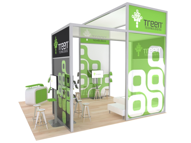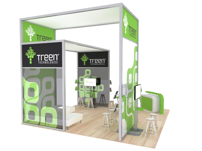 We often hear, "I'd like a comfortable booth space where customers can lounge and hear about our products and services." The VK-5096 does that ... and more! The large graphics and open construction invites attendees into your booth. Once there, they can sit at bar-height tables next to large monitors or relax in a semi-private lounge area. The layout makes it easy to engage your customers in face-to-face conversations or presentations. The island design includes an attractive reception counter with backlighting and storage. The large tension fabric graphics and engineered aluminum construction ensures a fast setup and years of use.