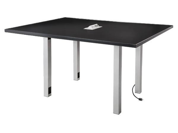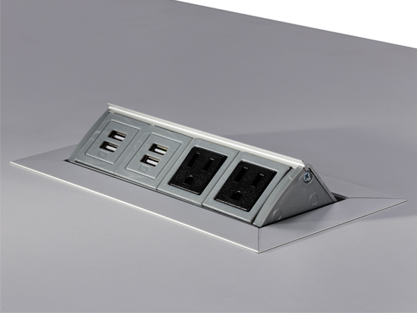 Modern powered conference table with laminate top and silver base. The powered flip top contains 2 AC outlets and 4 USB ports. One 110V power source is required for each charging hub. Tables can be daisy chained together depending on client layout. 10A max per charging hub. Dims: 60" L x 48" D x 29" H