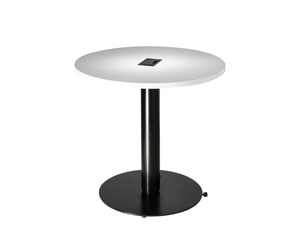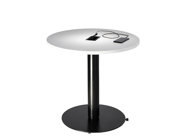 -- Trade Show Furniture RentalModern 30" round cafe table with black metal base features a power hub in the center with 1 AC and 2 USB ports, and wire management in the base. One 110V power source is required. Dims: 30" R, 29" H