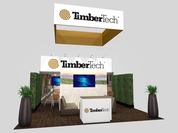 RE-9159 Island Rental Trade Show Exhibit -- Image 1Every great exhibit design starts with your trade show objectives. Seems simple. Yet, many exhibitors ignore features that would maximize their objectives... meeting space for example. The RE-9159, 9160, and 9161 islands are perfect for companies committed to spending quality time with existing or potential clients. They include casual and semi-formal meeting spaces, surrounded by large format graphics, large monitors, reception counter, and and even backlighting. The greenery dividers and accent pieces add a friendly, welcoming vibe while serving as convenient privacy dividers. There's even a large overhead hanging sign announcing your presence throughout the show hall.