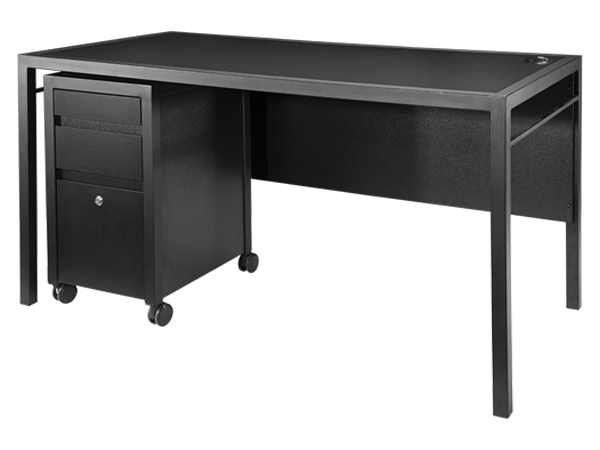Laminate Desk and File Cabinet with three metal drawers and black metal frame. The round power unit contains 3 AC outlets and 2 USB ports. One 110V power source is required for each charging unit. 15A max per charging unit.The round power unit contains 3 AC outlets and 2 USB ports. One 110V power source is required for each charging unit. 15A max per charging unit. Dimensions: 60"L 30"D 30"H