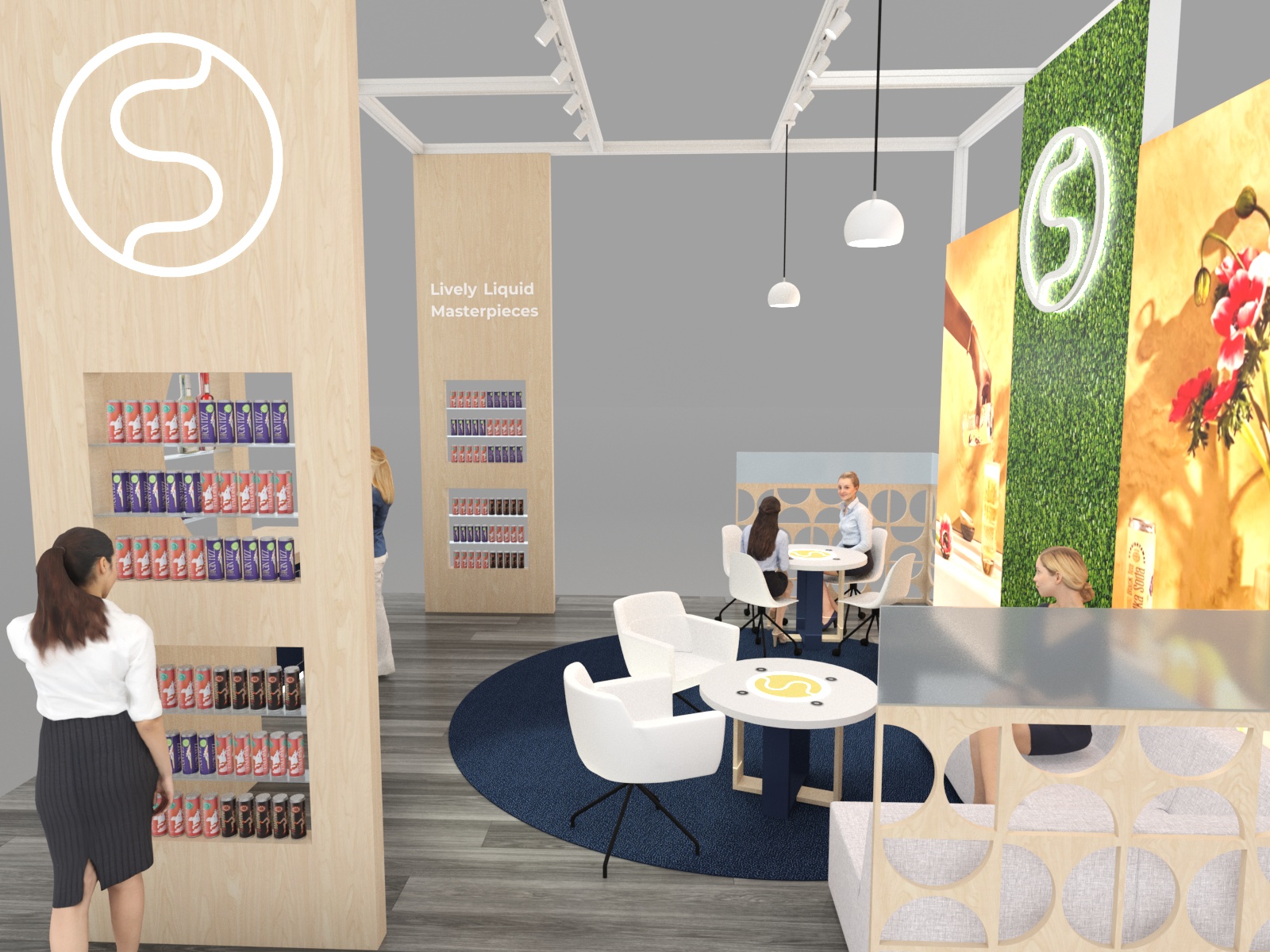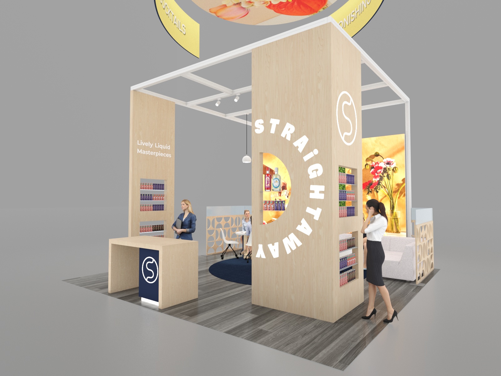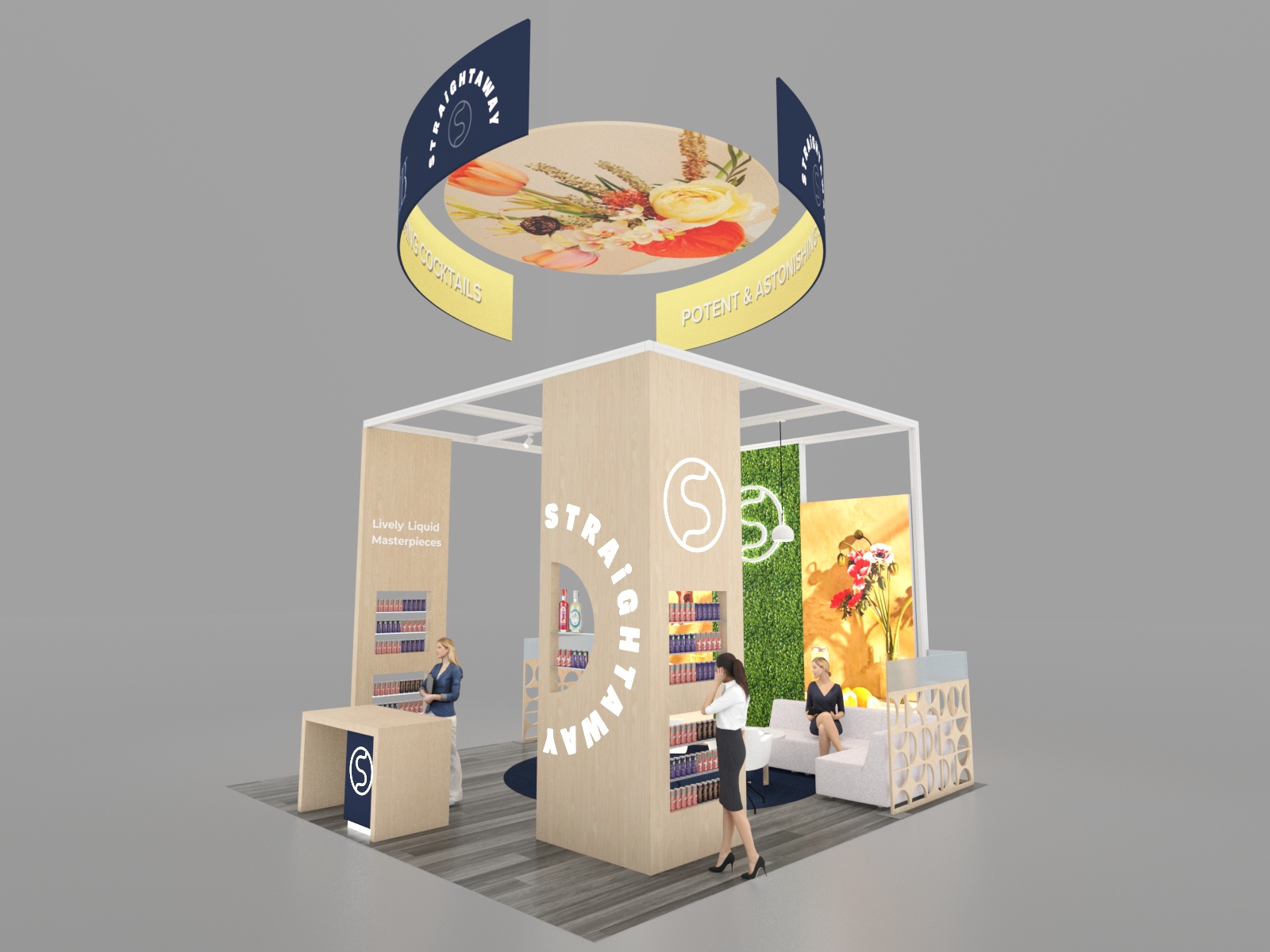 In a trade show environment increasingly dominated by video, lights, and hi-tech, an island design that evokes casual and comfortable is a welcome oasis on the show floor. The VK-5183 and VK-5186 embrace a relaxed vibe with casual seating meant for lingering conversations with attendees. In addition to the two seating areas, the design features multiple double-sided lightboxes with vibrant fabric graphics, iPad swivel mounts for demos, and ample product displays shelving. The overhead hanging signs are guaranteed to attract attention drawing attendees to the booth from throughout the hall.