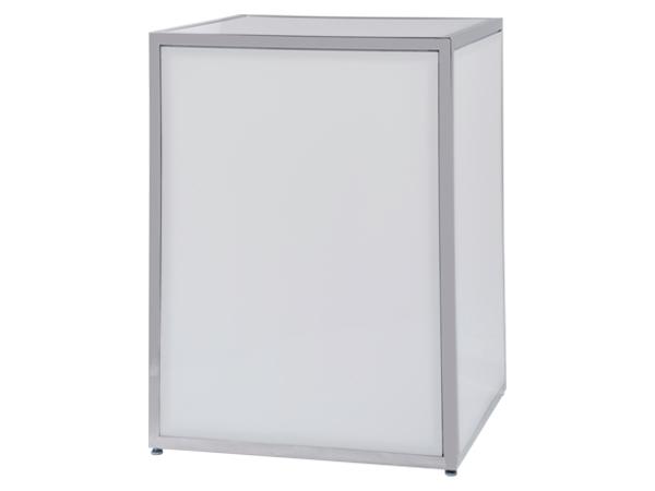 Posh Corner Bar Pedestal, Unlit (CEBR-006) -- Trade Show Rental FurnitureThis classic chrome framed corner bar with white acrylic panels is versatile and can be easily branded. Pair with the Posh Bar to expand your bar or receiption area. Dimensions: 30"L 30"D 40.25"H