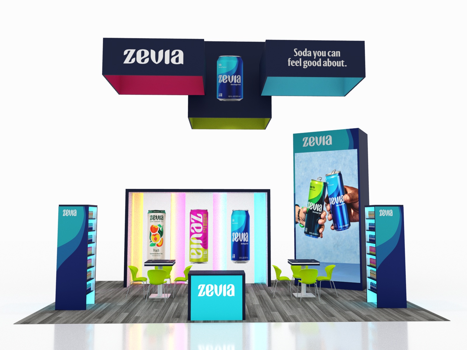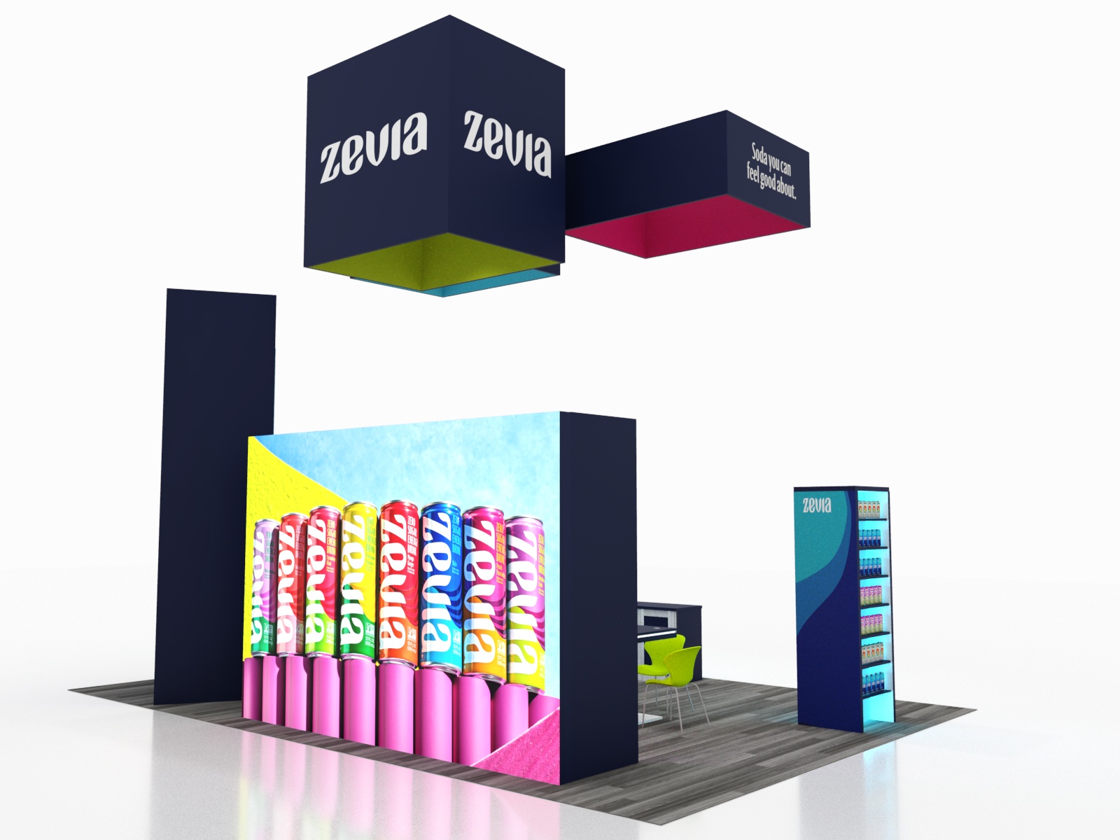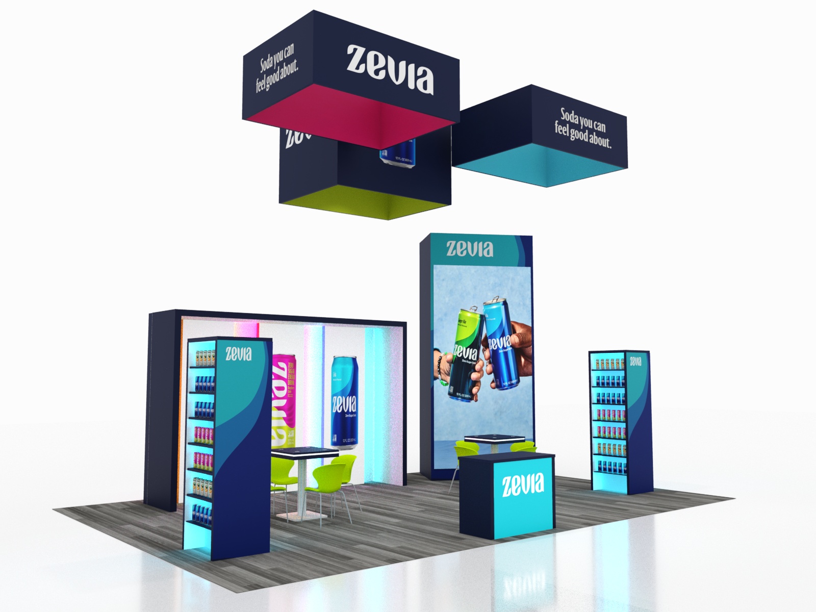 Next to the video wall is a large LED Lightbox with tension fabric graphics. The island exhibit includes open meeting space with (2) bistro charging tables and a backlit reception counter with lockable storage. Above... there are (3) hanging signs which will attract attention from across the show hall.
