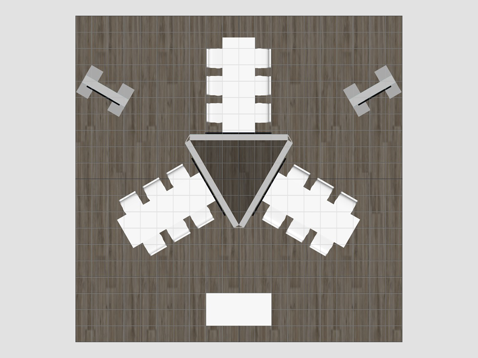 RE-9187 Island Rental Trade Show Exhibit -- Image 1LED Lighting has transformed exhibit design. Trade show exhibits are brighter, and backlighting custom shapes has gotten easier. For example, the triangle towers in the RE-9187, RE-9188, and RE-9189 islands. Triangle towers offer similar visibility as square or rectangle towers, but with one less side of graphics (and less cost). The towers are structural so they're ideal for large monitors on one, two, or three sides.