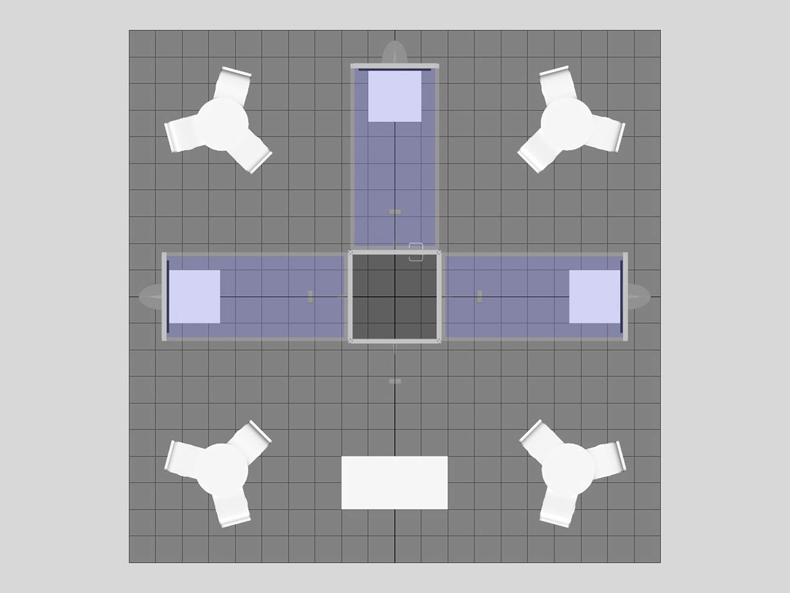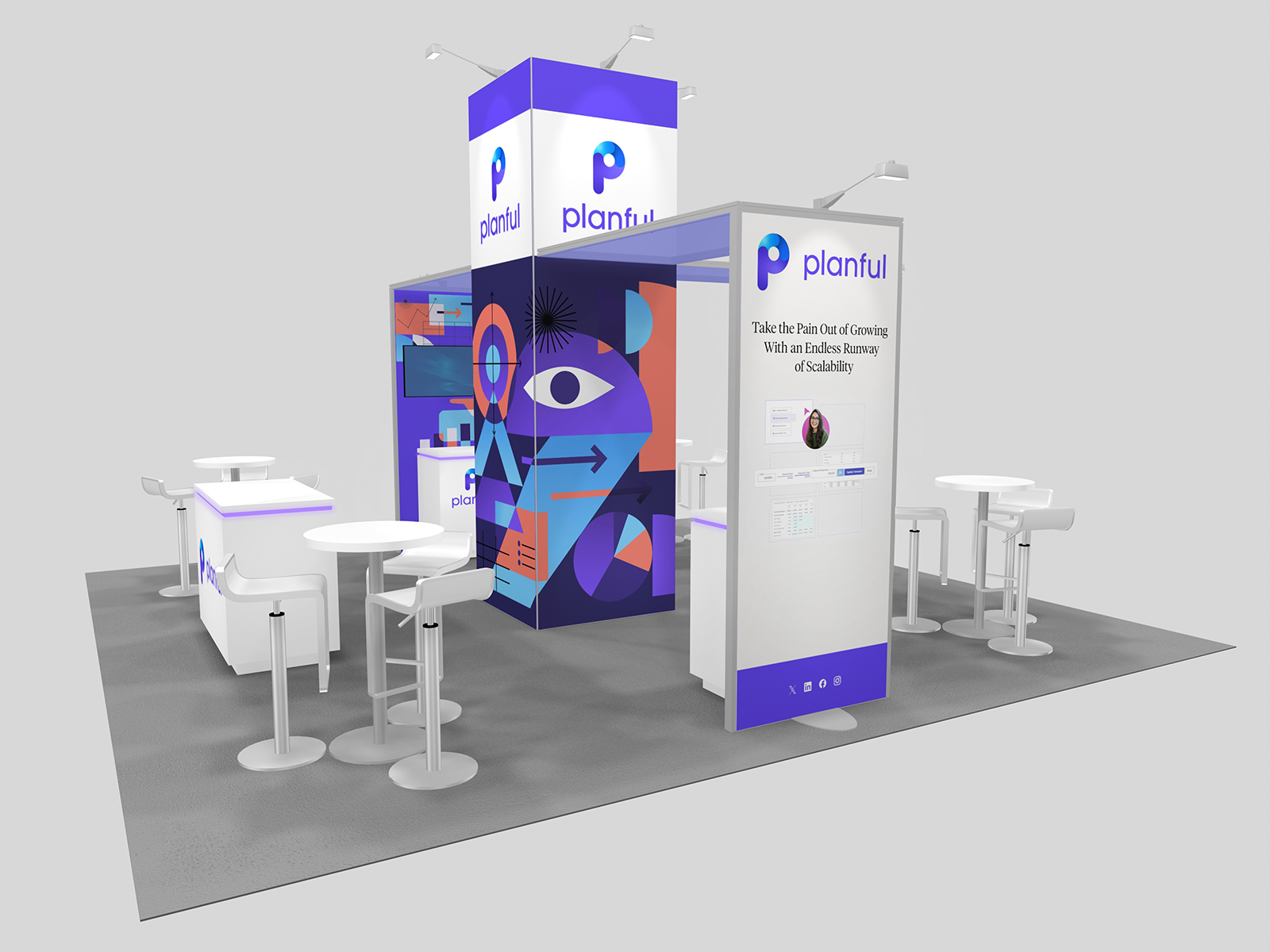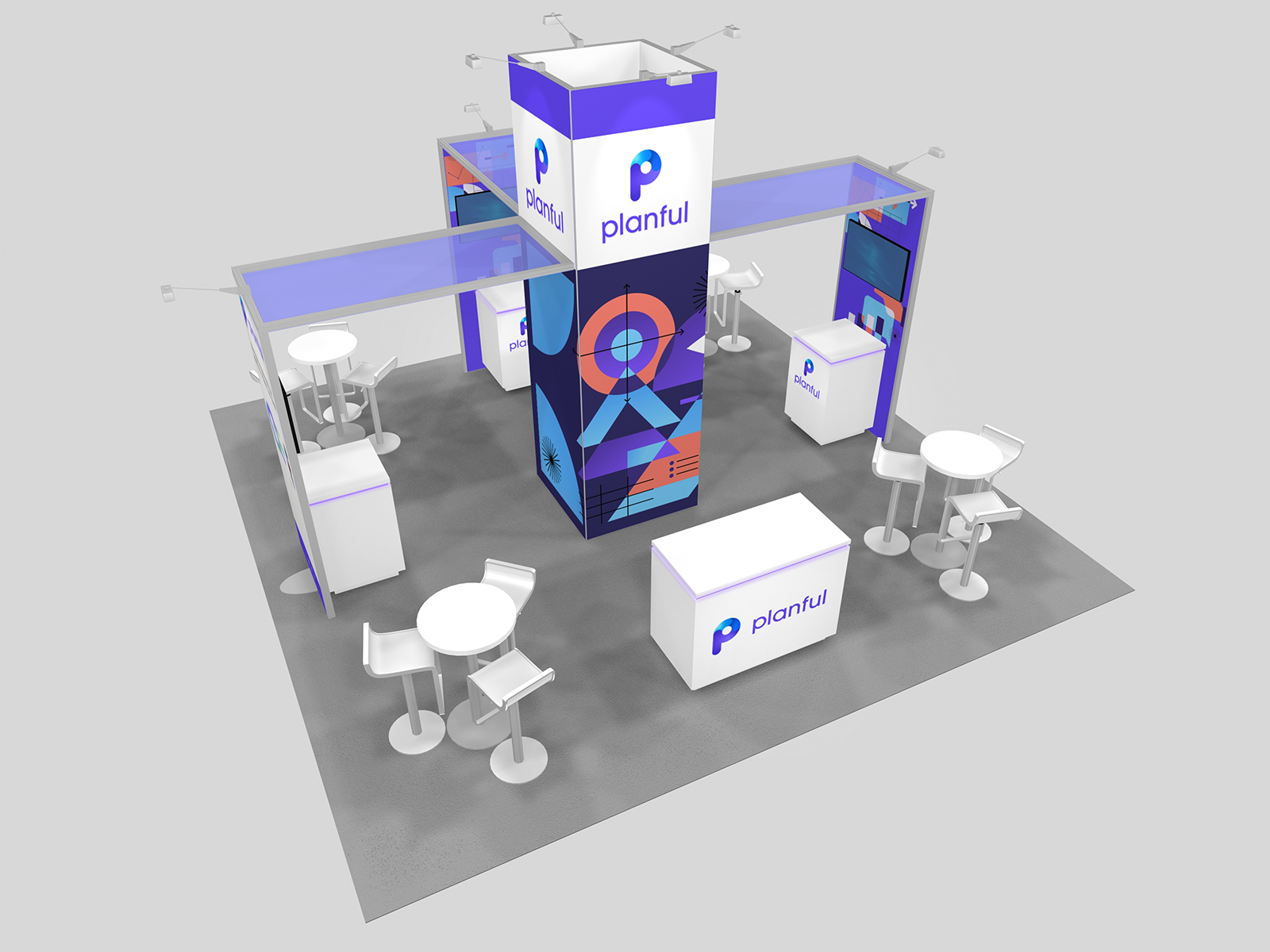 The RE-9193 takes a minimalist approach with backlit graphics, demo stations, a reception counter and an open lounge with a charging coffee table. The RE-9194, on the other hand, places video towers on the corners and the open floorplan invites traffic into the extensive seating area with curved sofas and charging tables. The hanging sign attracts attention throughout the show hall while centering the seating area in the island. Finally, the RE-9195 spreads the seating into the four corners of the booth using bistro tables and chairs. The demo stations and tower are in the center of the island for more privacy.