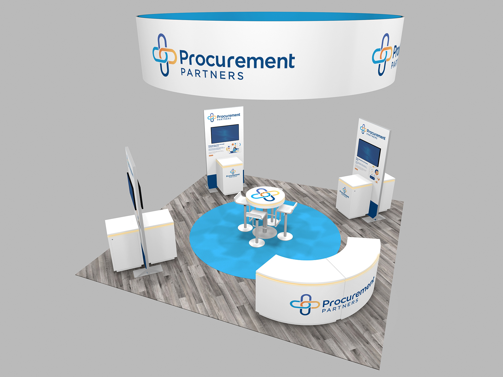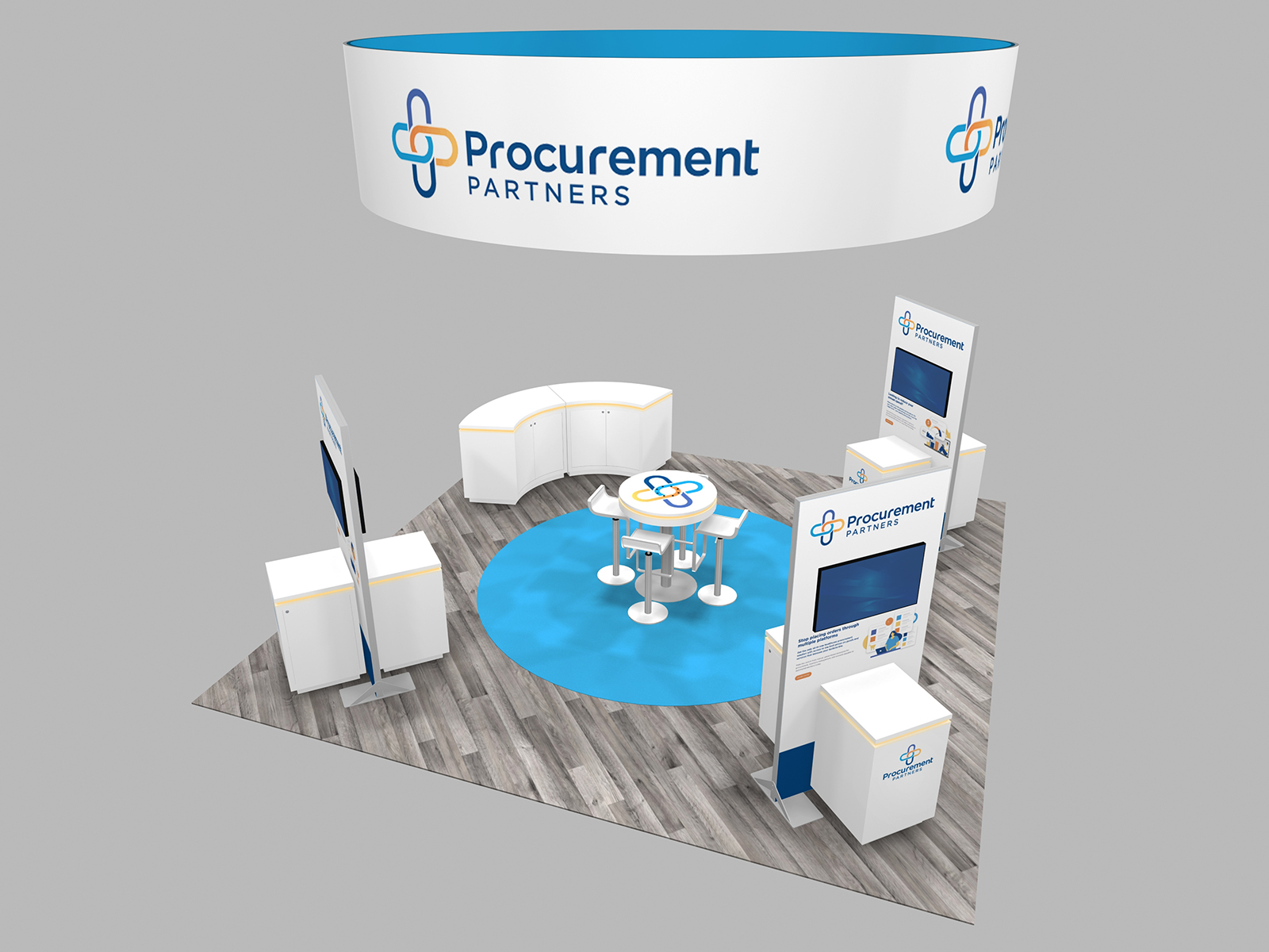 RE-9196 Island Rental Trade Show Exhibit -- Image 1Big round hanging signs will always attract crowds, like bees to nectar. The rental island designs RE-9196, RE-9197, and RE-9198 all have round hanging signs, but in three variations. From a straightforward 16 ft. diameter sign to 16 ft. circles inset with a 12 ft. flat or 3D signs.