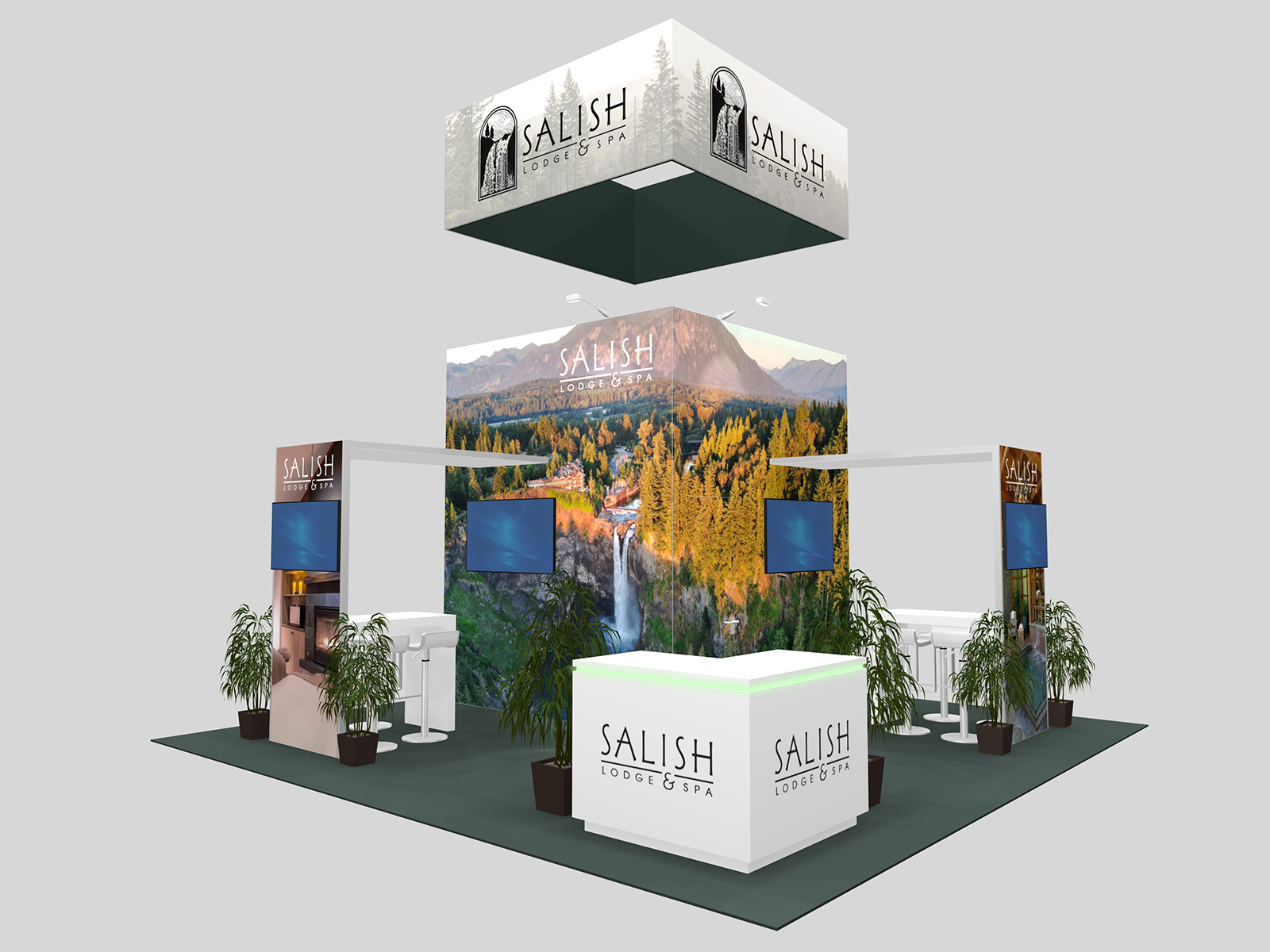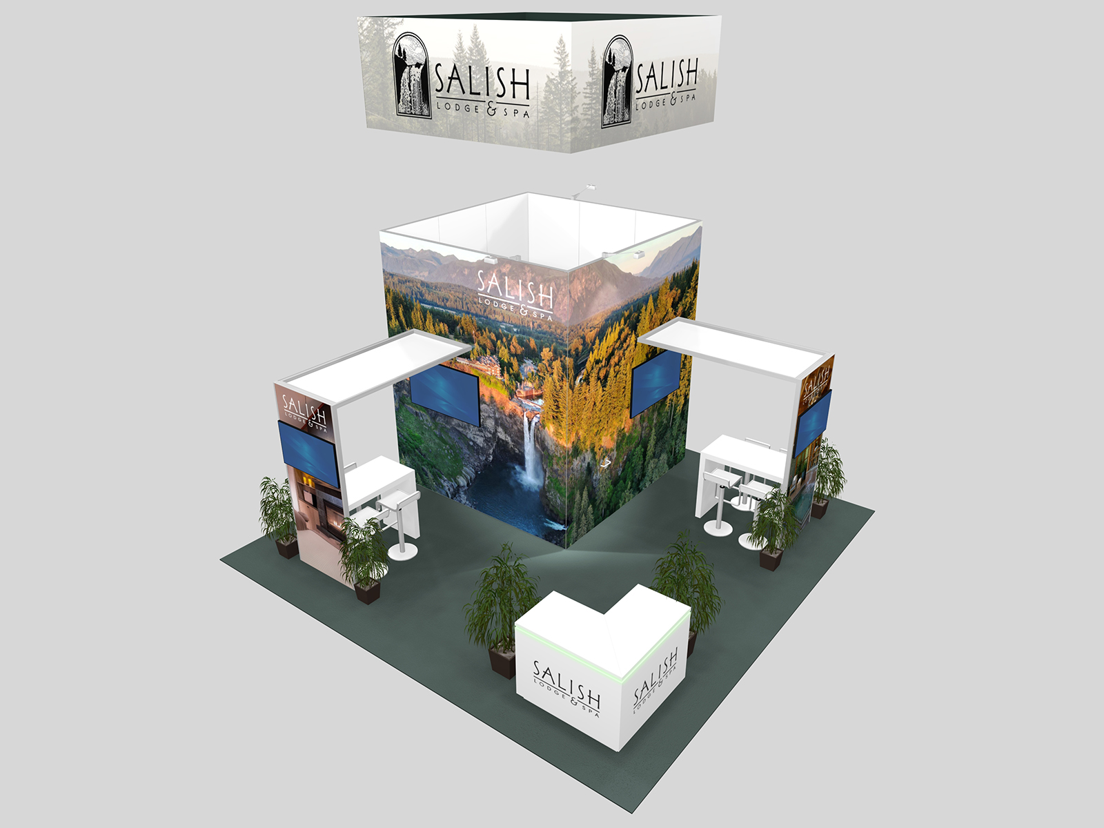 RE-9211 Island Rental Trade Show Exhibit -- Image 1Canopies are cooler than ever before! More and more trade show island designs are incorporating canopies to add depth and dimensionality. The RE-9211, 9212, and 9214 series shows how canopies can stretch the booth space while also creating semi-private meeting areas for demos and meetings.