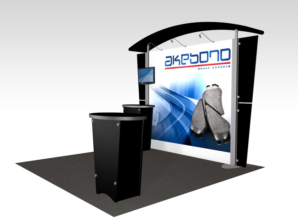 Quite often, a few custom elements added to the design can give the entire design a custom look even if it’s as simple as some colorful laminated workstations, shelves, or a reception counter. Custom laminated soffits and backlighting are also nice touches that are inexpensive and well worth the investment. As a bonus, if you re-rent the same exhibit, your second rental will most likely be less expensive, since your first rental covered the cost of those custom components.
