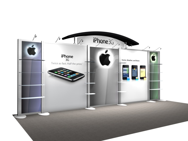 Quite often, a few custom elements added to the design can give the entire design a custom look even if it’s as simple as some colorful laminated workstations, shelves, or a reception counter. Custom laminated soffits and backlighting are also nice touches that are inexpensive and well worth the investment. As a bonus, if you re-rent the same exhibit, your second rental will most likely be less expensive, since your first rental covered the cost of those custom components.