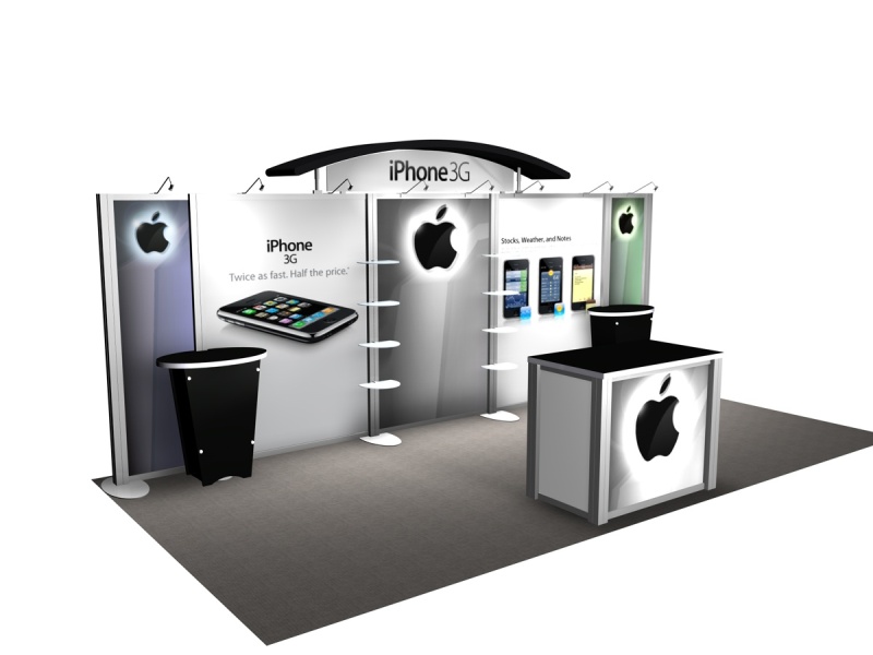 Quite often, a few custom elements added to the design can give the entire design a custom look even if it’s as simple as some colorful laminated workstations, shelves, or a reception counter. Custom laminated soffits and backlighting are also nice touches that are inexpensive and well worth the investment. As a bonus, if you re-rent the same exhibit, your second rental will most likely be less expensive, since your first rental covered the cost of those custom components.