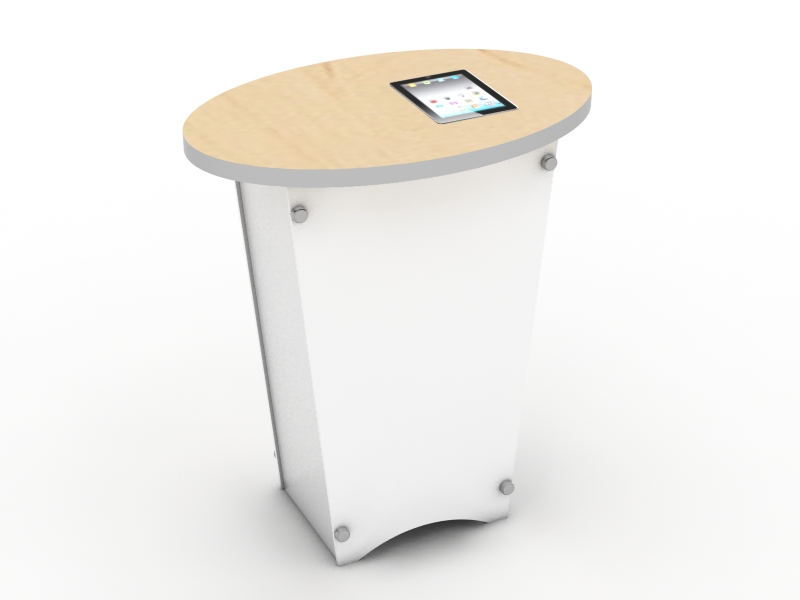 When choosing the right counter or pedestal for your display, consider how you will use it on the show floor. Do you need locking storage? Will the counter or pedestal hold a lead retrieval machine, laptop, or other electrical device? If so, you will need wire management. That may be as simple as ordering a grommet for the counter. If you are planning to use a tablet computer, consider the tablet insert option for the counter top. This option is practical, attractive, and secure for many tablets, such as an iPad.