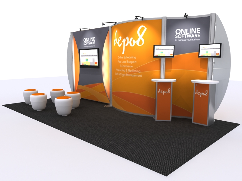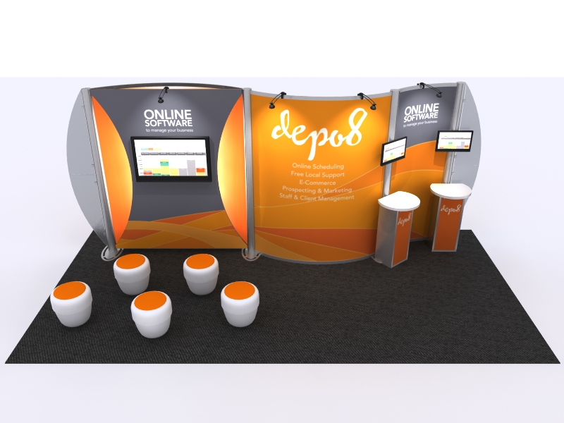 It's a common question. "As my company grows, I expect my trade show needs to expand. Are there any displays that will re-configure to larger sizes?" Most modular displays can grow as your trade show needs change. The VK-1106, VK-2934, and VK-3003 take the guesswork out of the question. Whether you need a 10 x 10 and then expand to a 10 x 20 or 10 x 30, these exhibits will adapt to your evolving marketing goals. Or, if you know you need a 30 ft. inline for your major show, but smaller configurations for other shows, then this series is perfect. Not only does it include large format fabric graphics, but it also has plenty of A/V opportunities with small workstations and a comfortable presentation area.