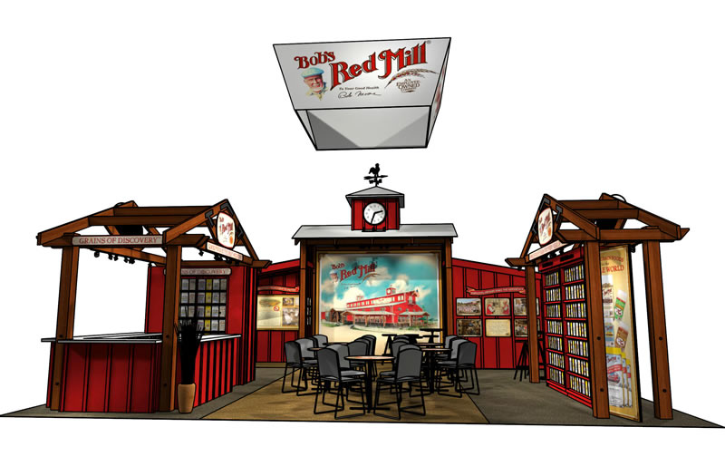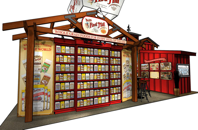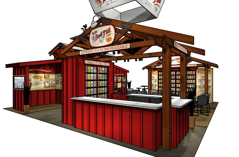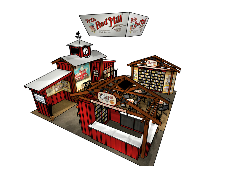 The custom DM-100 consists of three main structures. The biggest has a 12’ x 12’ backlit fabric graphic that dominates the structure. On either side of the 12 x 12 graphic are informational alcoves. The opposite side contains another informational alcove and walk-in store with extensive shelves. The second structure is for product displays, featuring four 4-foot sections, much like a retailer would see in a store. End caps are hanging fabric banners.