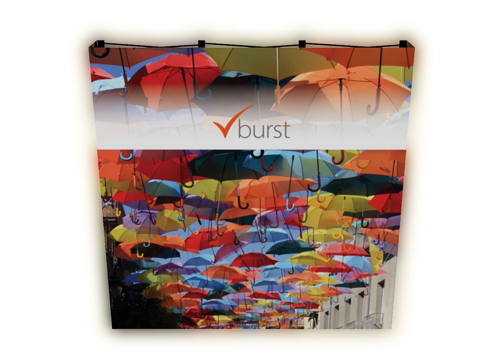 V-Burst 8 ft Flat BACKLIT Are You Ready for something really Amazing? The V-Burst Fabric Pop Up Comes with the Graphic Already Attached to the Frame. Just Expand the Portable Frame and the Vibrant Fabric Graphic Does all the Work. It’s So Simple Your Display is Ready Before Your Exhibit Neighbors have Unpacked Their Case.