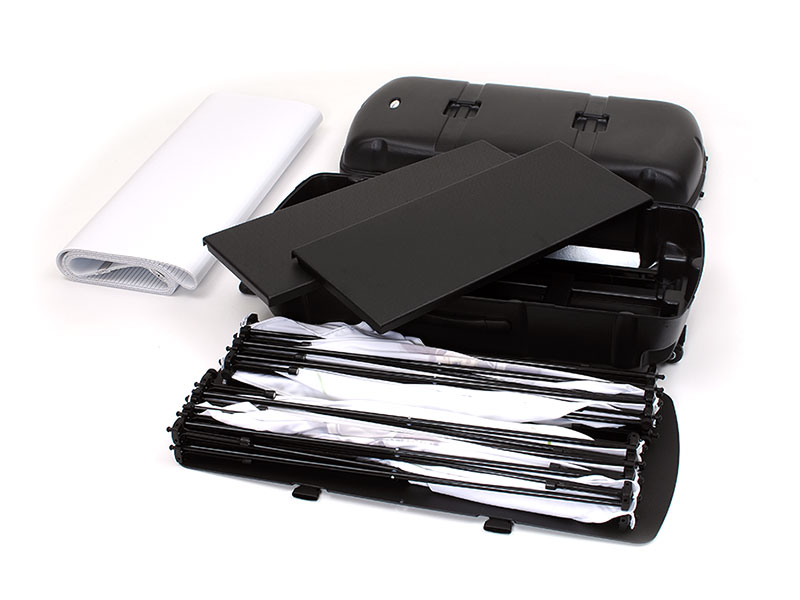 Store your display set-up, pack only to transport and then steam after display is set-up.VBURST fast sets up fastVBURST black hard shipping case - can be converted to a graphic counter. Available as upgrade purchaseVBURST black nylon carry bag included
