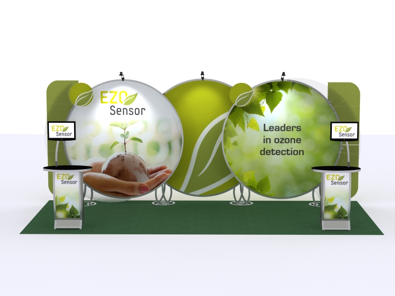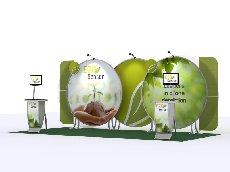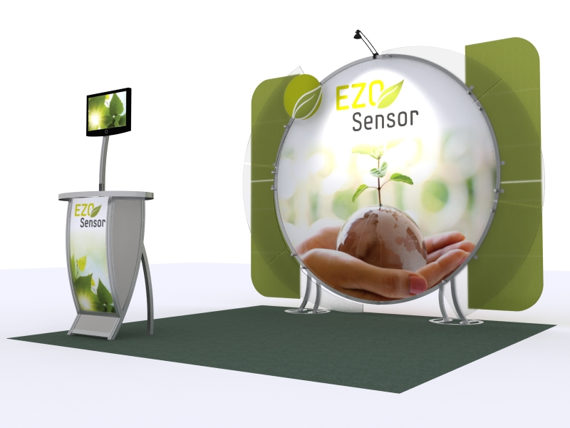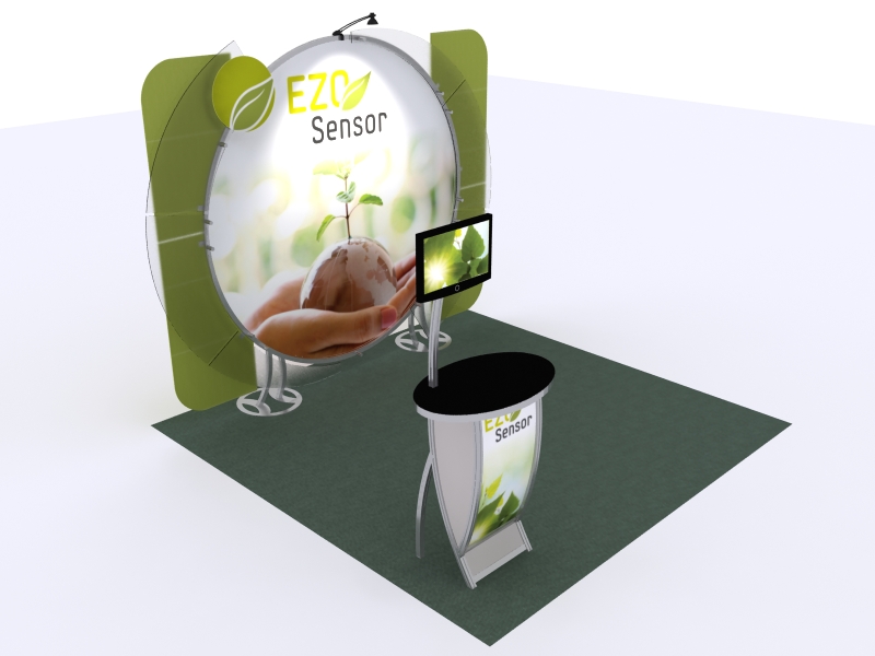 VK-1320 Trade Show Exhibit -- Image 1If 50 is the new 30, then circles and curves are the new squares and rectangles. Here's the bottom line:  You go to a trade show to be seen, so be seen with an exhibit that elicits "Oohs and Aahs." Don't settle. The VK-1320 and VK-2919 do more than communicate your message with bold tension fabric graphics and colorful accent wings. They have a power and presence to stop an attendee in the aisle. That's what you want from a trade show display. Both reconfigurable 10 ft. and 20 ft. versions come with VK-1605 workstation, which is perfect for an A/V demo or just guiding a potential client through your website.