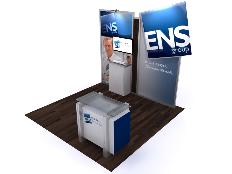We love this design. Simple, straightforward, and effective. It puts the message first and complements it with practical accessories and a comfortable meeting space in the island version. All the large format graphics are vibrant tension fabric for high-impact and low-maintenance. In both the inlne and island versions, there's a workstation counter(s) with a monitor, perfect for one-on-one presentations. The reception counter has been a favorite with a solid, upscale appearance, complete with extensive storage. Best of all, you never have to worry about reconfiguring your exhibit, go from a 10 ft. to a 20 ft. inline, to a 20 x 20 island.