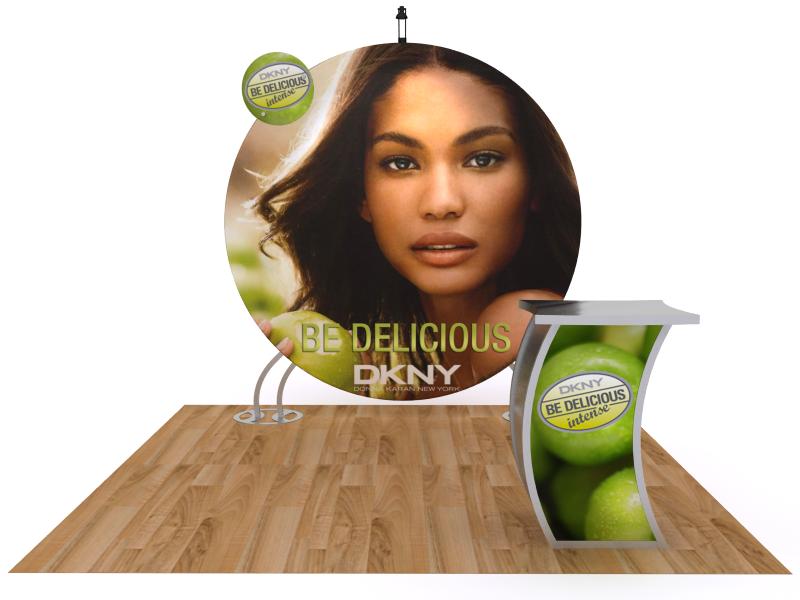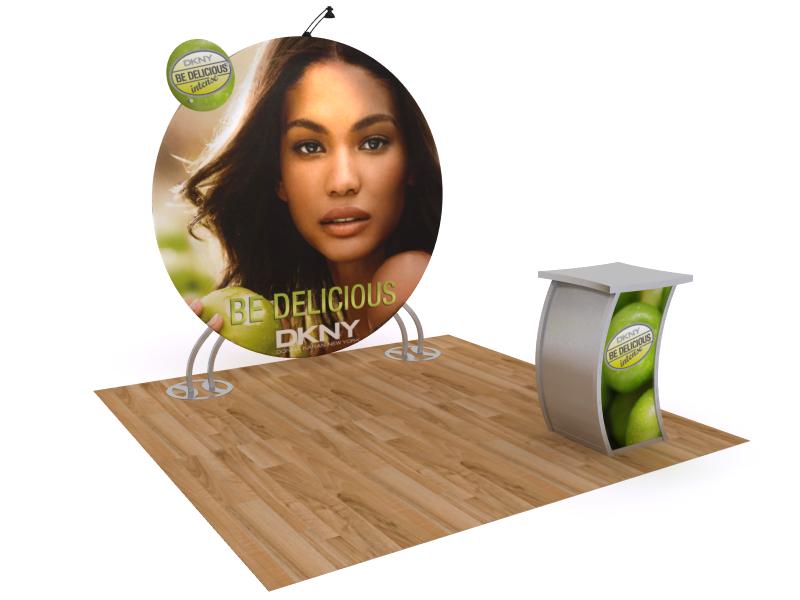 TF-508 Trade Show Exhibit -- Image 1Whatever design you choose for your next trade show exhibit make sure it reflects your organization's overall vibe. The TF series has two distinct advantages. First, the round display design makes a strong visual statement. It's unmistakable on any show floor. Second, the assembly is decidedly casual with push-button connectors for the large center ring(s). The larger graphics are tension fabric pillowcases with zippers. Nothing could be easier. There's even a standoff graphic for additional branding and a curved pedestal with locking storage.